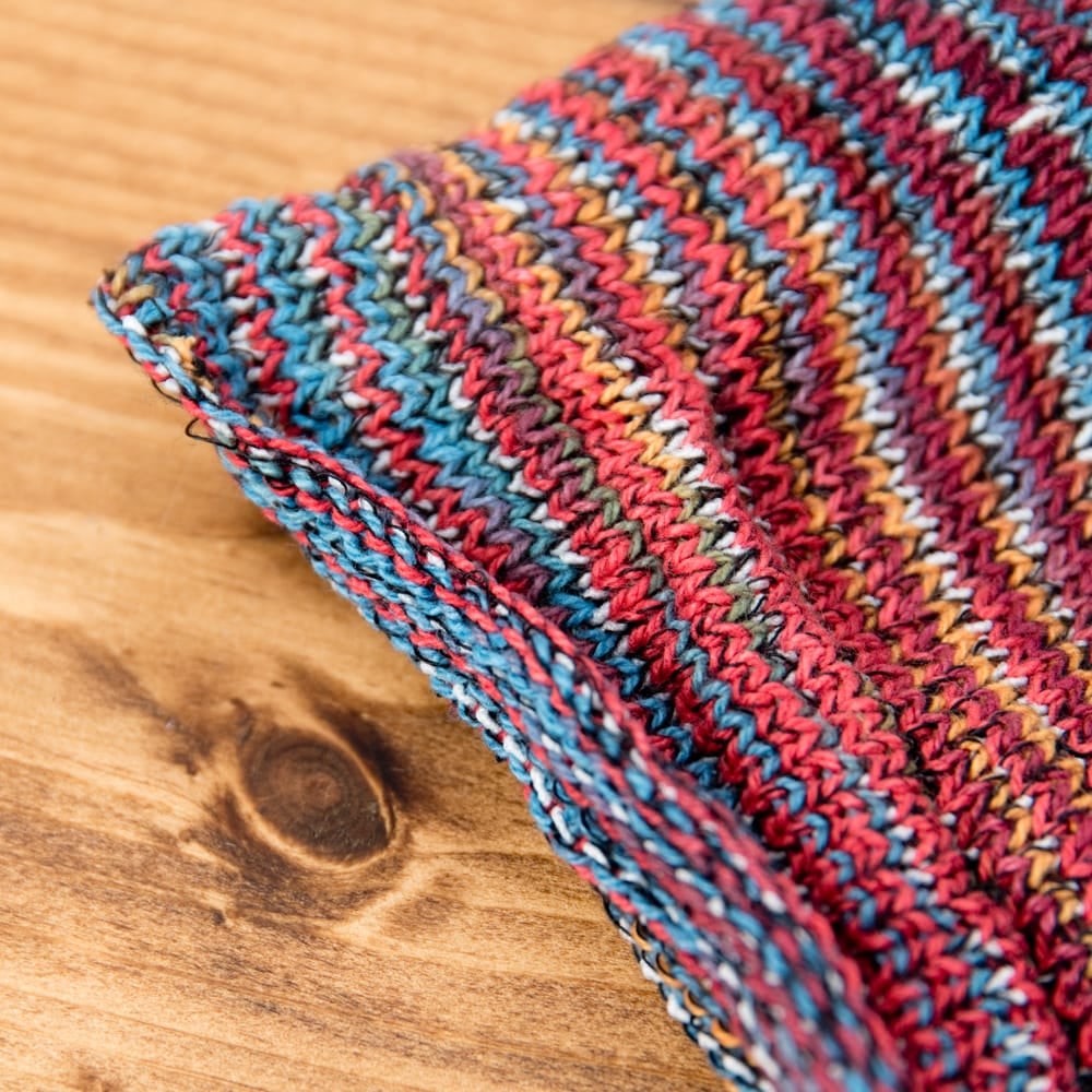 筒状の端は編みっぱなしで自然にくるくる丸まっているのですが編み糸の始末をしていないので、屑糸が暫くは服や髪につきます。