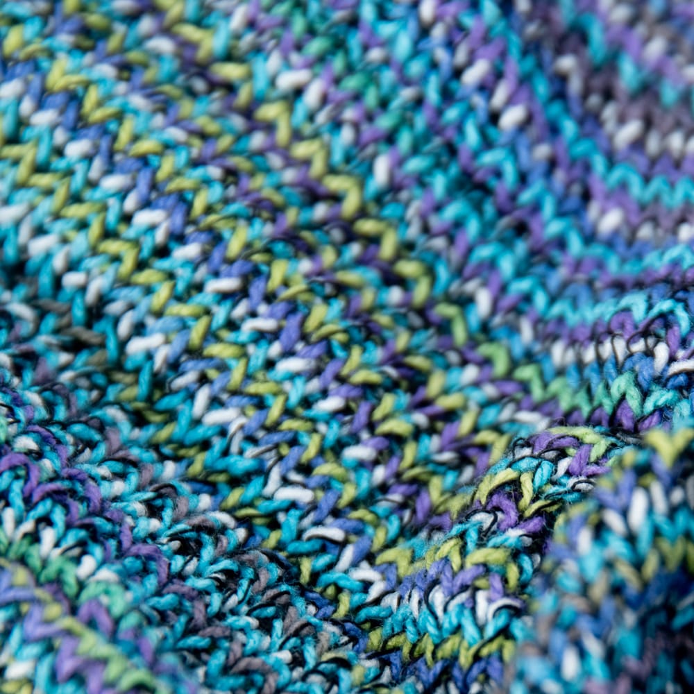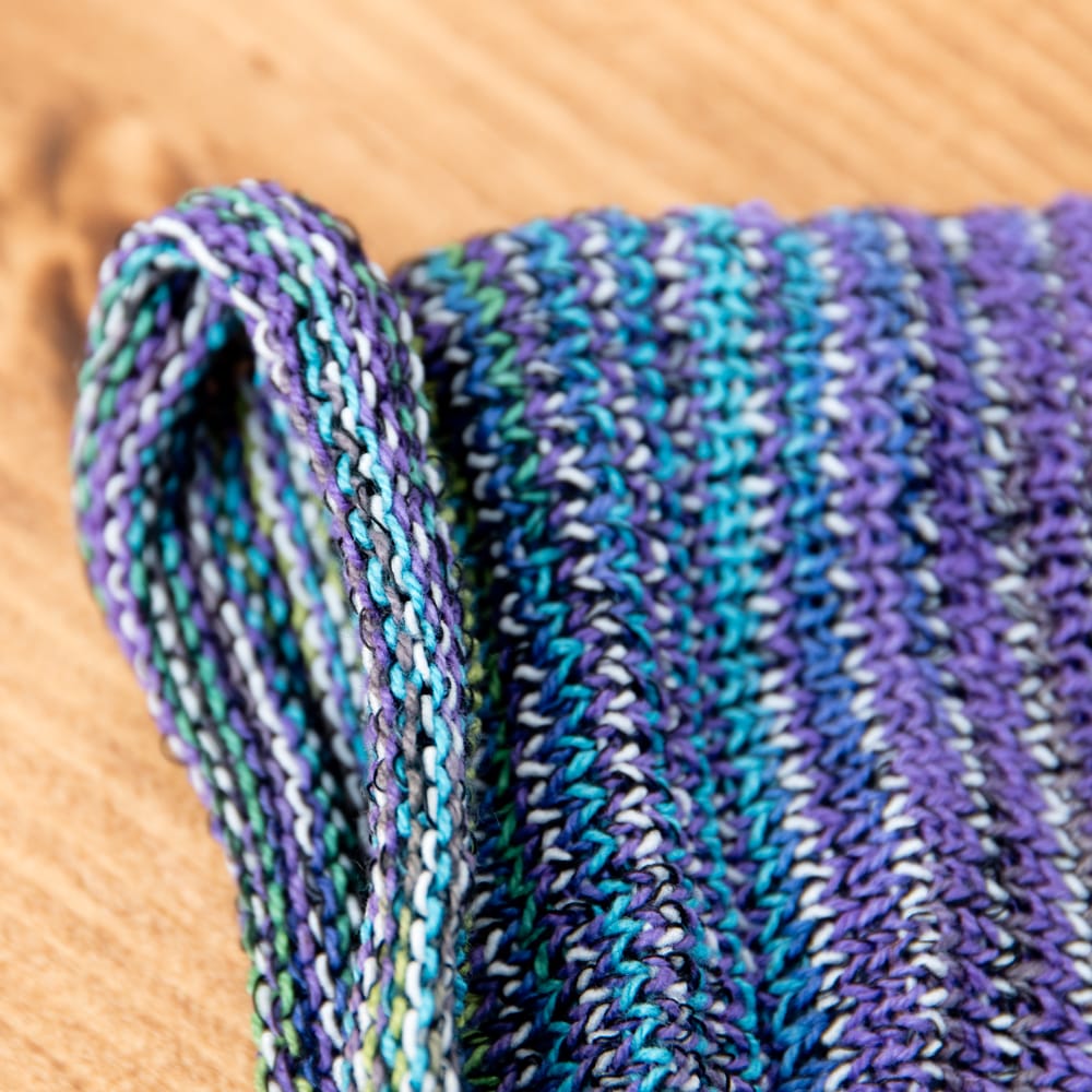 筒状の端は編みっぱなしで自然にくるくる丸まっているのですが編み糸の始末をしていないので、屑糸が暫くは服や髪につきます。