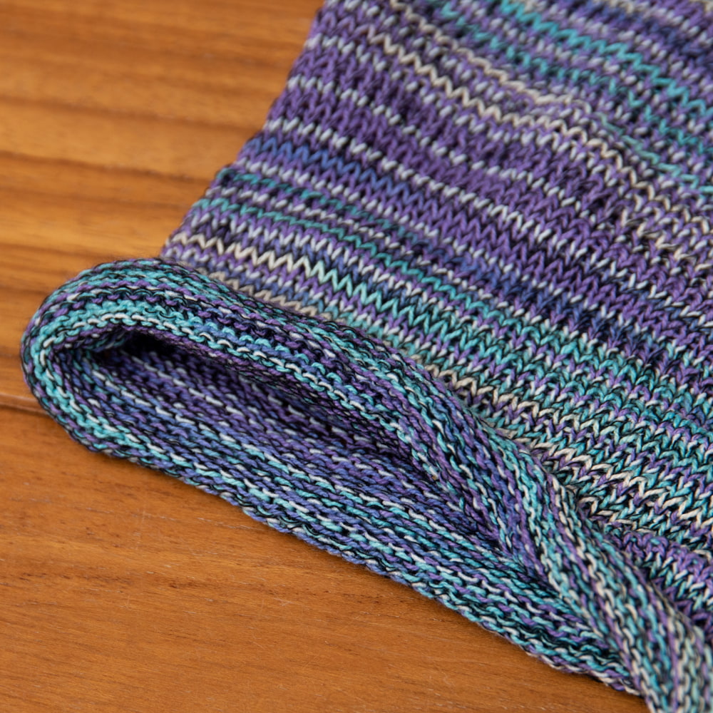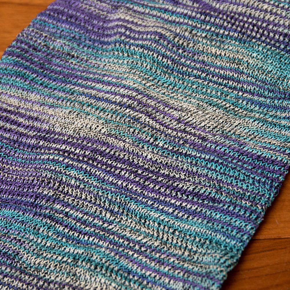 筒状の端は編みっぱなしで自然にくるくる丸まっているのですが編み糸の始末をしていないので、屑糸が暫くは服や髪につきます。