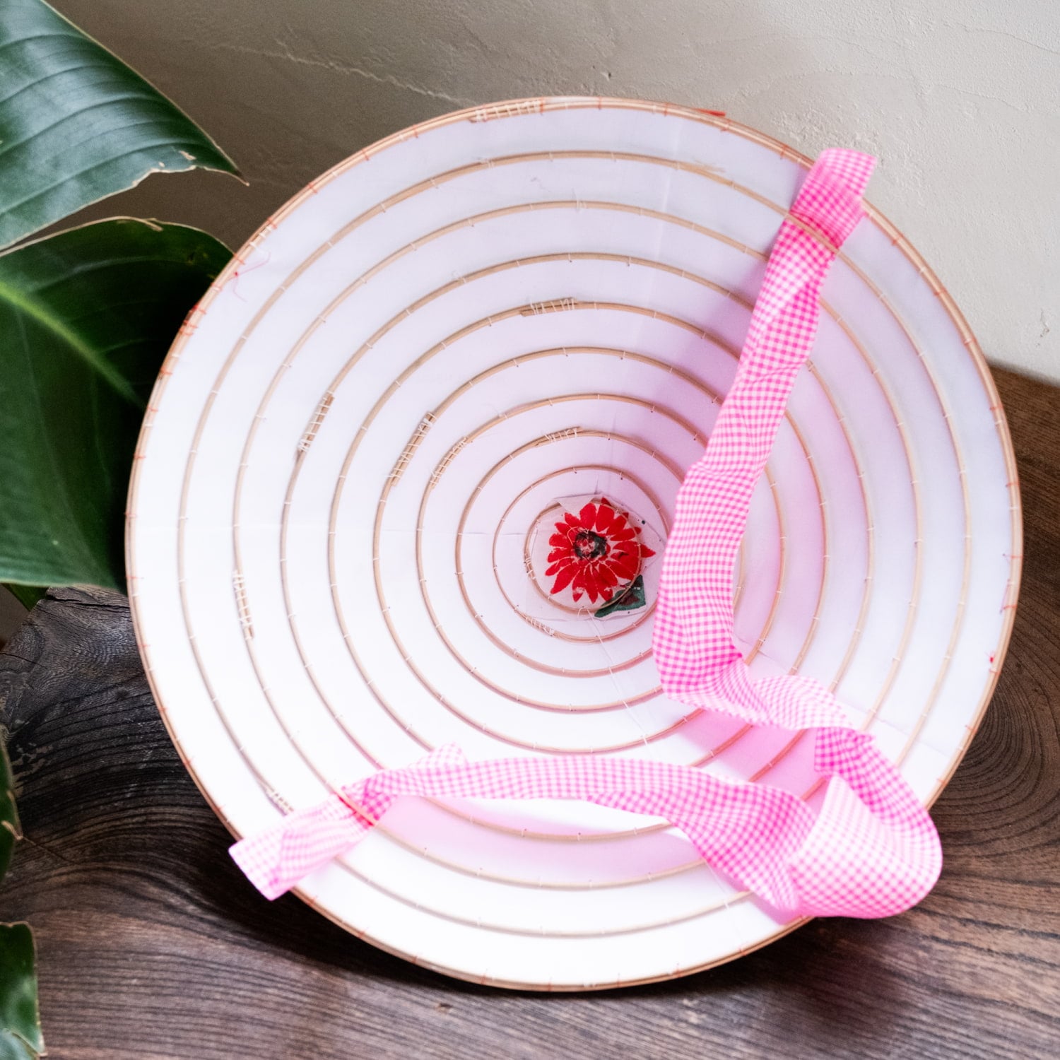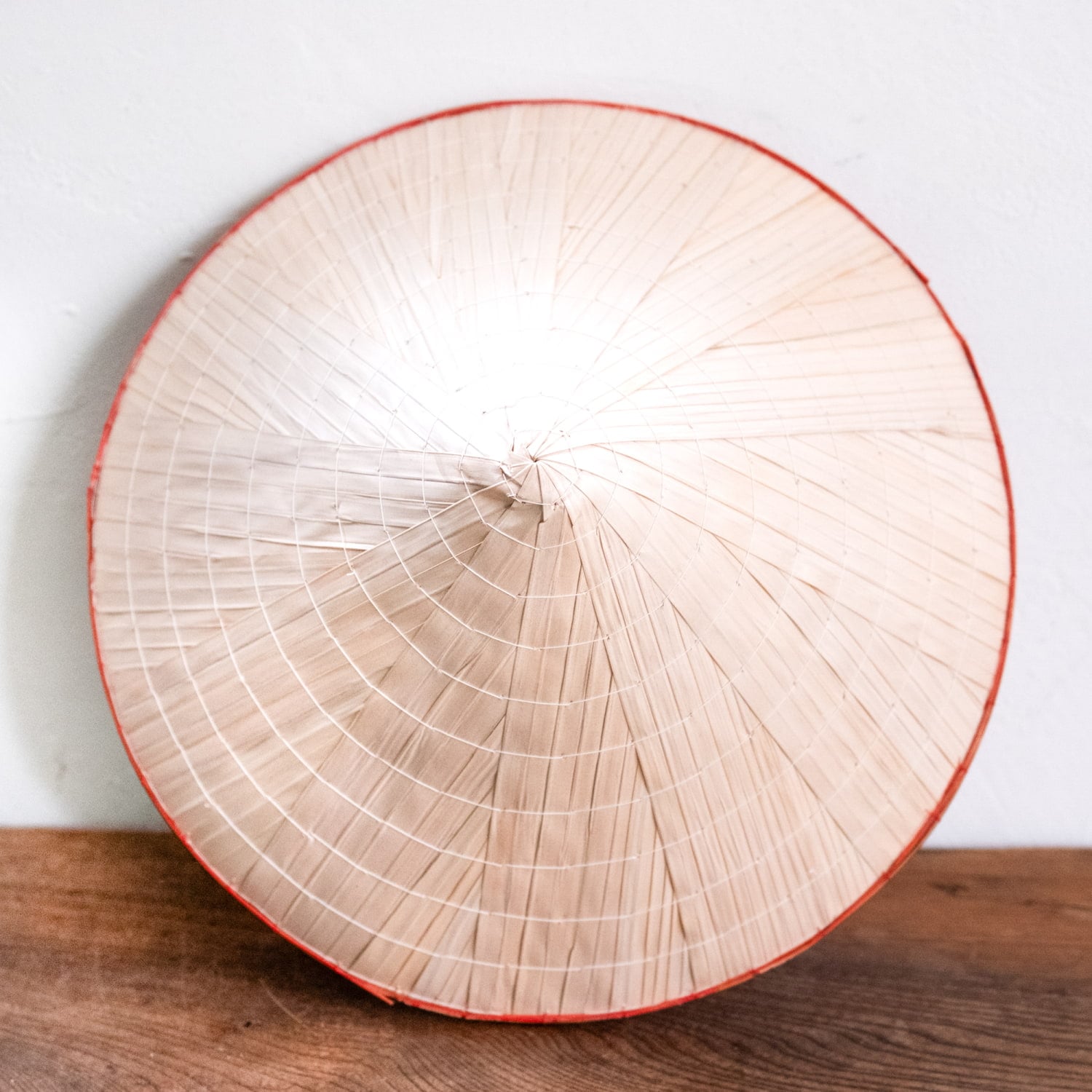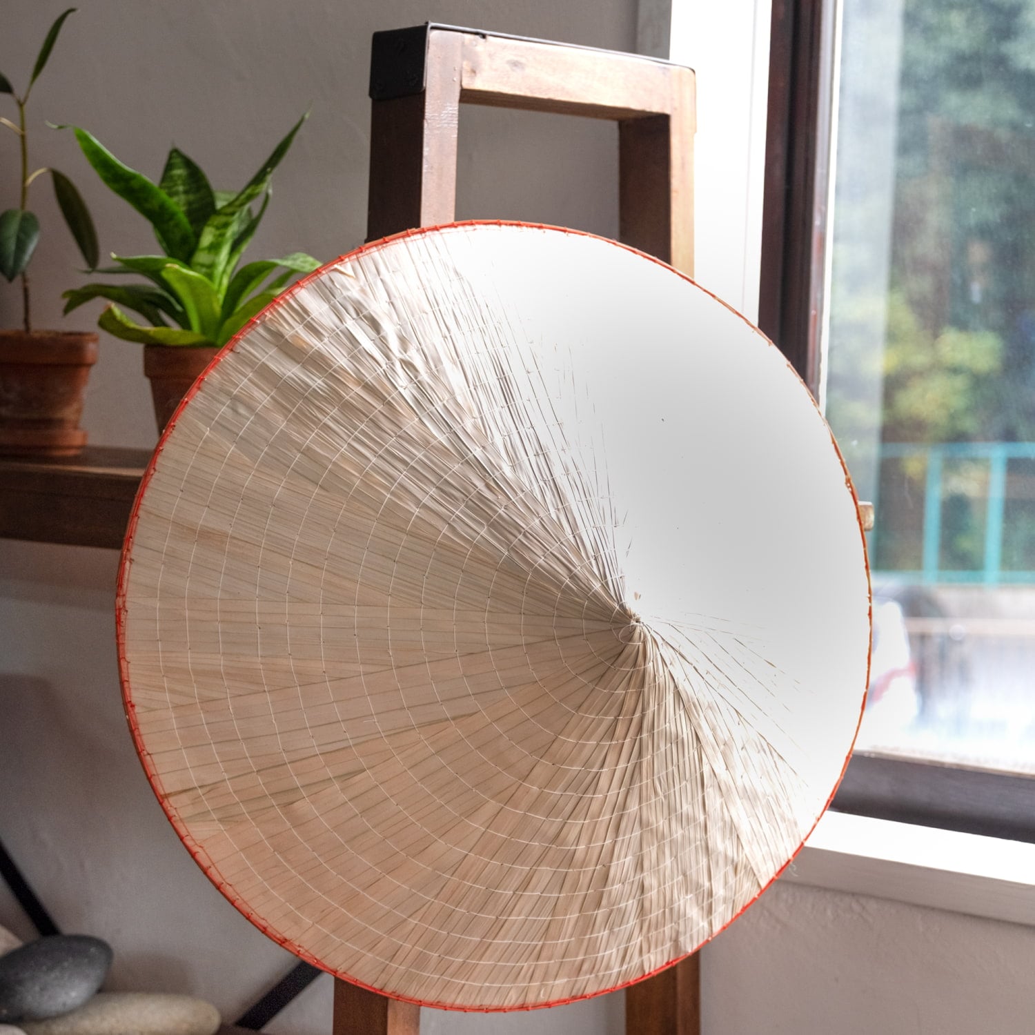 ご購入時にはあご紐(クアン・ノン)用のリボンを一緒にお送りいたします。お好みに応じて、S・Mサイズは内側の竹ひごの隙間から入れてお使いください。 Lサイズは内側に専用のループ(赤い糸)があります。そのループにリボンをくぐらせ、結びますが、その際にリボンは顎の真下で結ぶのではなく、少し耳の後ろに流して結ぶと、ベトナムの女性のようなエレガントな雰囲気になります。