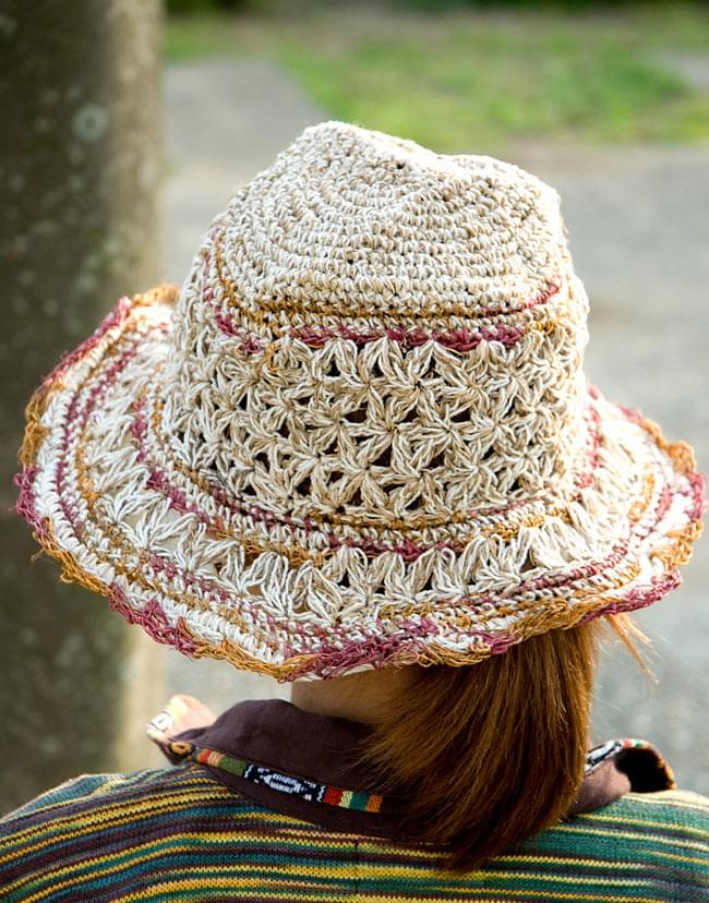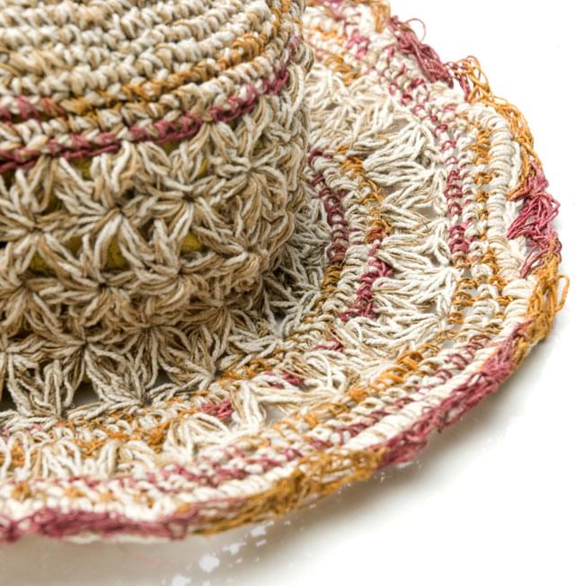 この帽子は、ネパールの人たちがそのヘンプの糸を使って一つ一つ、手で作っていきました。自然素材ならではの色合いと、やさしい風合いが魅力的ですね。つばの部分にはワイヤーが入っているので、つばの形を自由に変形することができてとっても便利です。つばを広げたり、折ったりするだけでもイメージが変わるので、色々お楽しみくださいね。