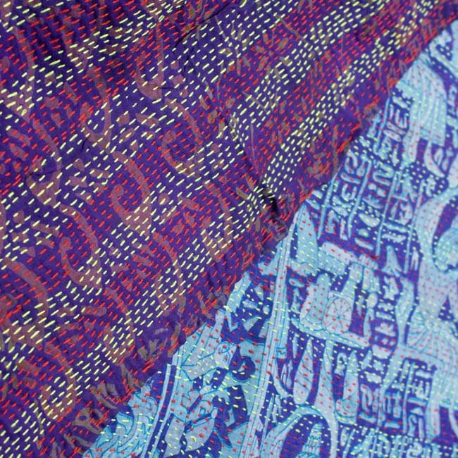 キルトのようなもう少し厚手のものをイメージしていましたが、ツルっとした生地を重ねてランニングステッチしたもので軽くてふわっとしています。全体に広げて鏡に当ててみると、光沢やグラデーションがとても上品で本当に美しいです。大きなサイズと迷い、とりあえずこちらの小さい方にしましたが、また他のも購入したいです。もう少しお安くなると嬉しいのですが。。材料にする予定ですが、このままストールとして使ってもステキですね。軽くて暖かく、重宝しそう。ステッチ糸がそのままなのもポイントになっていて可愛いです。