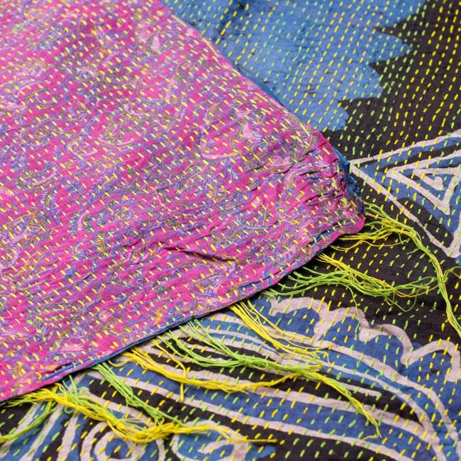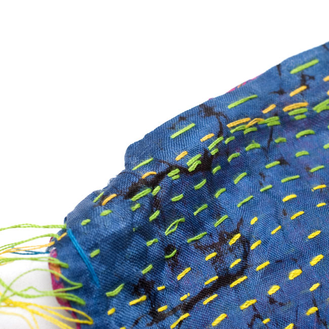 糸の色や布地の柄、その組み合わせが絶妙。肩にかけたり、首に巻いたり、お部屋のインテリアにしてみたり。ちょっと使用するだけでも、その絶妙な色のバランスと質感が不思議な存在感を出してくれます。シンプルなコーディネートが一気に華やかになり、上品なエスニックな雰囲気をお楽しみ頂けると思います。■インドの刺繍 – カンタの作り方