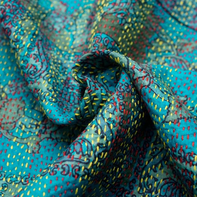 キルトのようなもう少し厚手のものをイメージしていましたが、ツルっとした生地を重ねてランニングステッチしたもので軽くてふわっとしています。全体に広げて鏡に当ててみると、光沢やグラデーションがとても上品で本当に美しいです。大きなサイズと迷い、とりあえずこちらの小さい方にしましたが、また他のも購入したいです。もう少しお安くなると嬉しいのですが。。材料にする予定ですが、このままストールとして使ってもステキですね。軽くて暖かく、重宝しそう。ステッチ糸がそのままなのもポイントになっていて可愛いです。