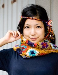 たくさんお花が付いているカラフルマフラーです。可愛らしい印象で、女性らしいエスニックファッションにピッタリです〜!