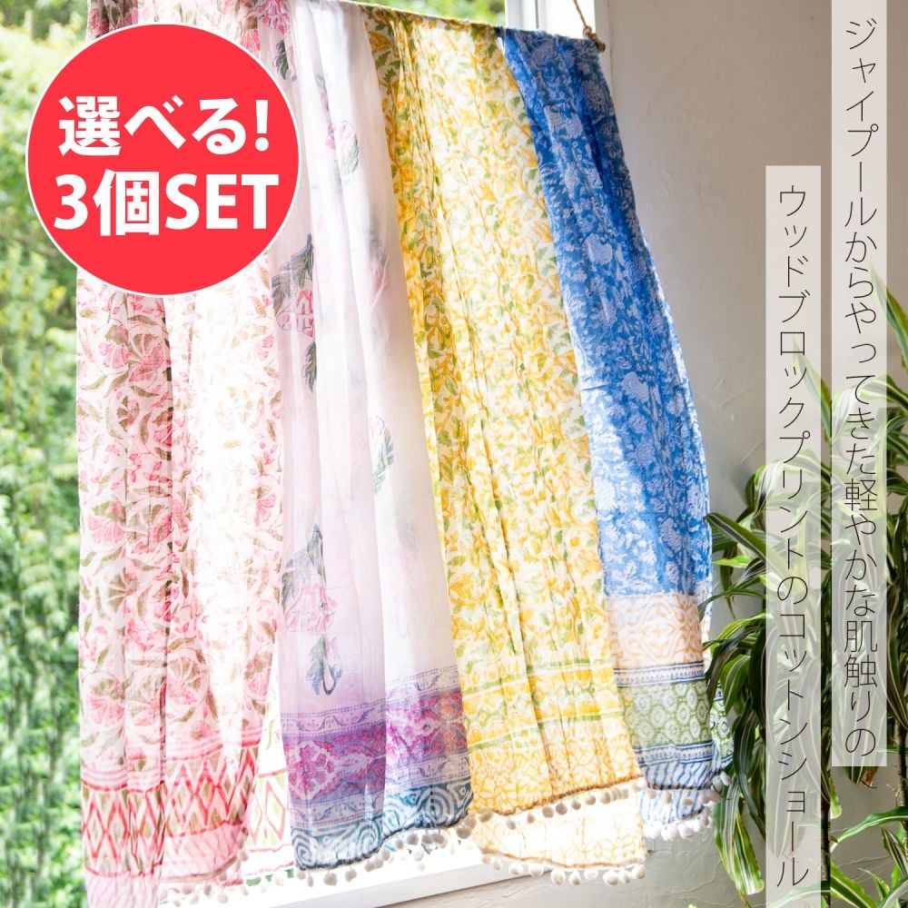 【自由に選べる3個セット】軽やかな肌触り ウッドブロックのコットンショール 通販店