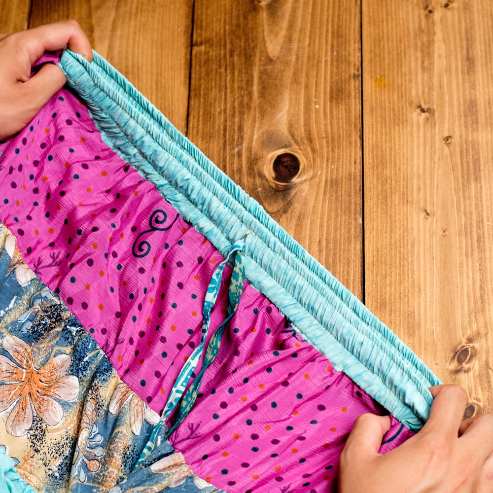 使われているサリー生地は層のようにトータル4種類。それぞれをつなぎ合わせたパッチワークになっています。さらに、アンティークサリーなので、それぞれが同じ組み合わせのない一点もの。自分だけの特別な1枚になりますよ。また、お送りするスカートは、ハンガーに掛けて片方を広げてある写真一枚目の物となります。
