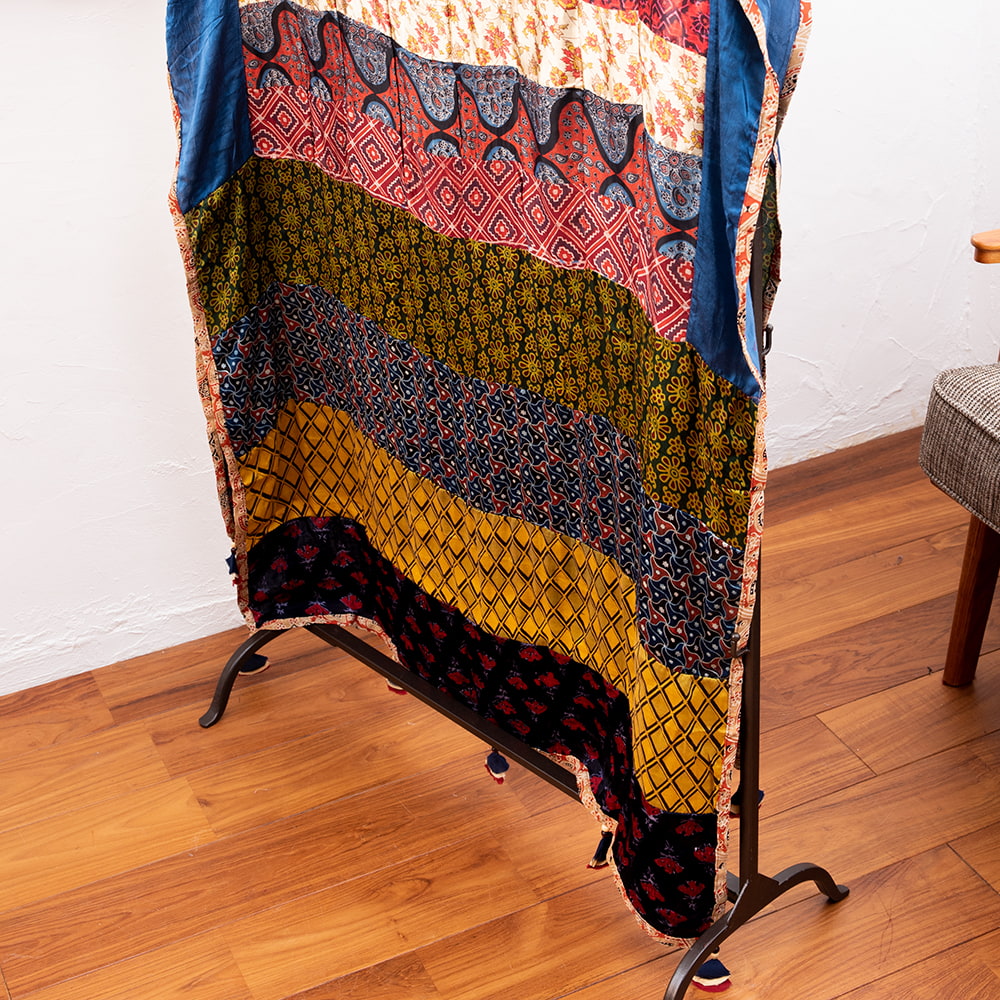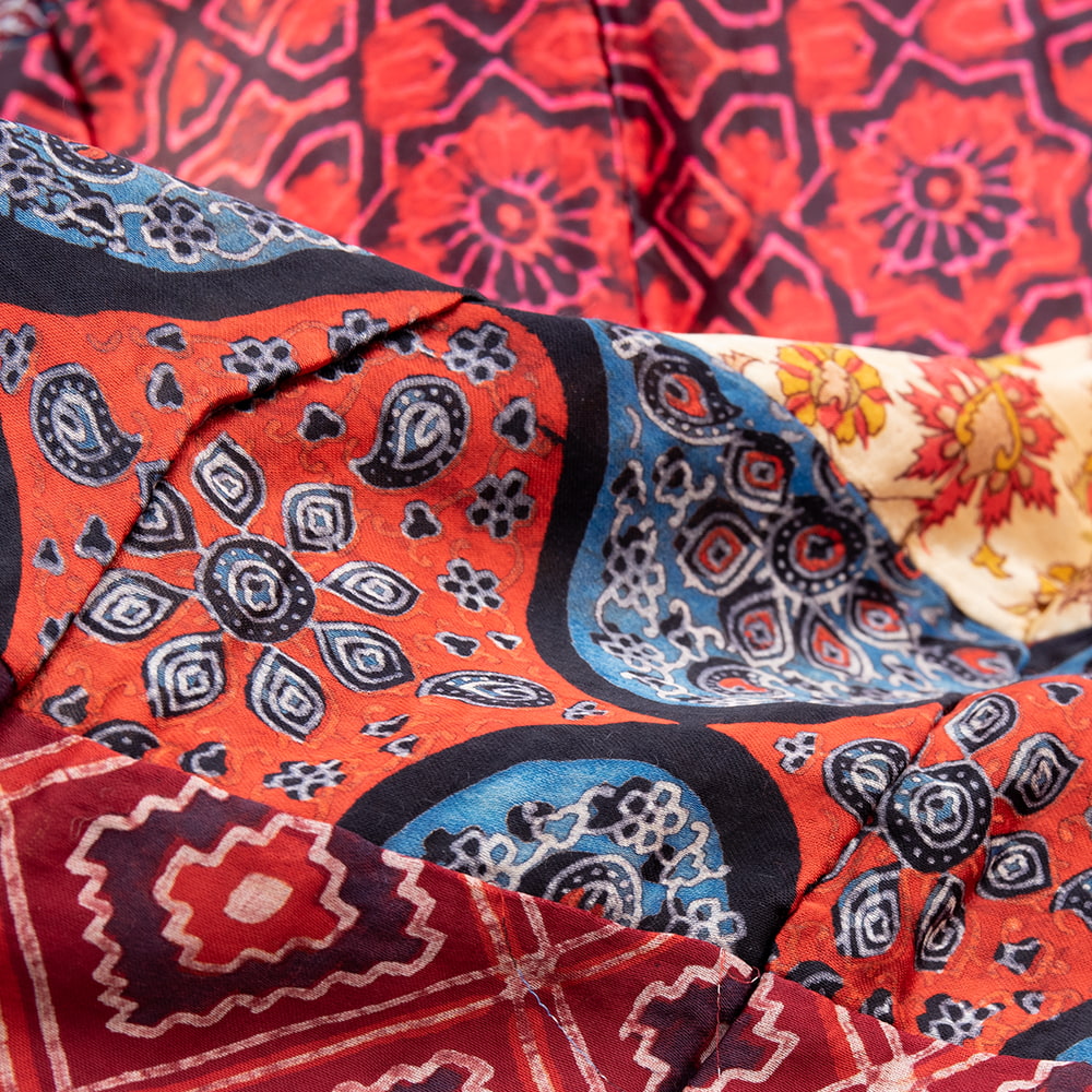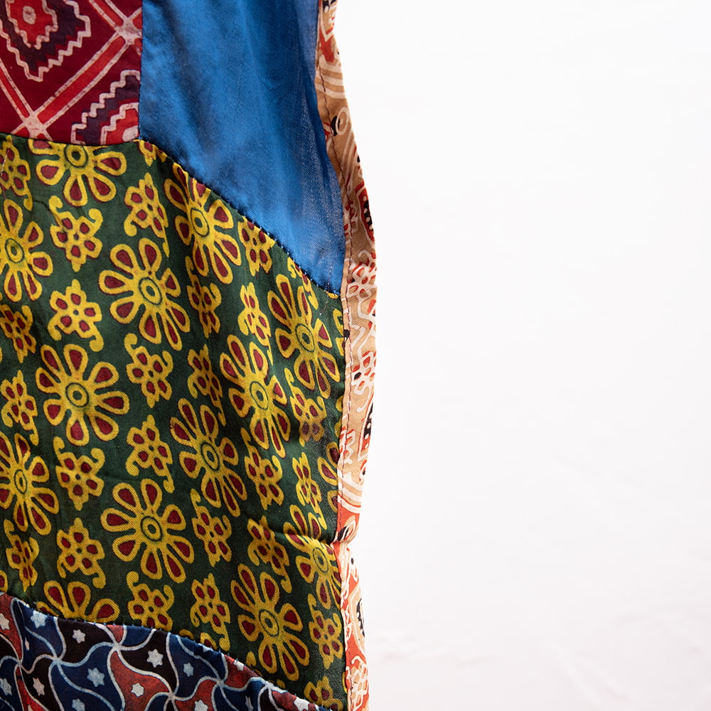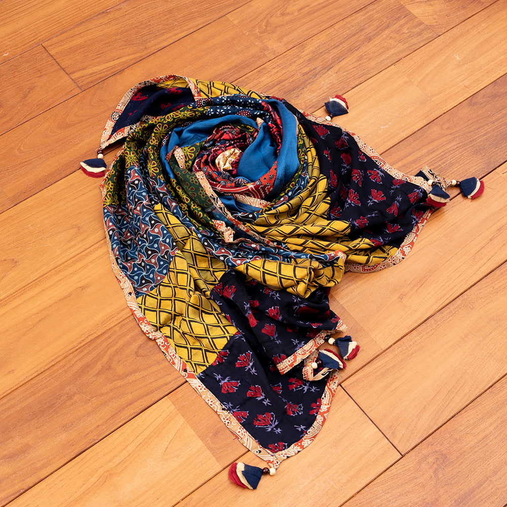 アジュラックプリントやカラフルな生地を組み合わせてできたドゥパッタはすべて1点もの。生地職人がまっさらな生地にアジュラックプリントを施し、美しい生地を完成させます。出来上がった生地は縫製職人に渡り、手作業でパッチワークを作り上げています。トーンを抑えた色味、真ん中を中心に左右対称に配置された柄のおかげで、見た目よりもコーディネートしやすく使いやすいです。