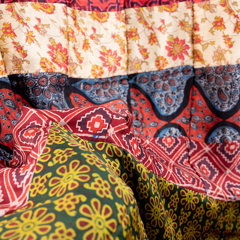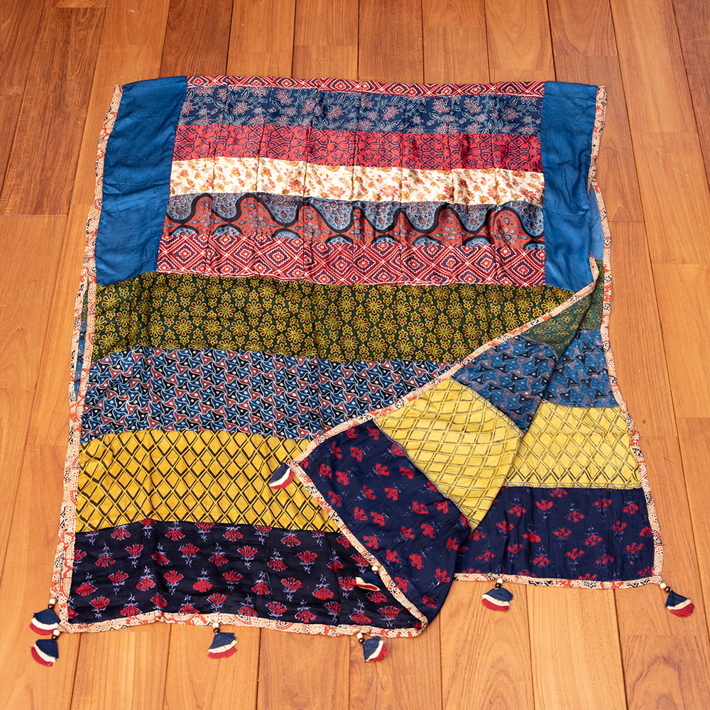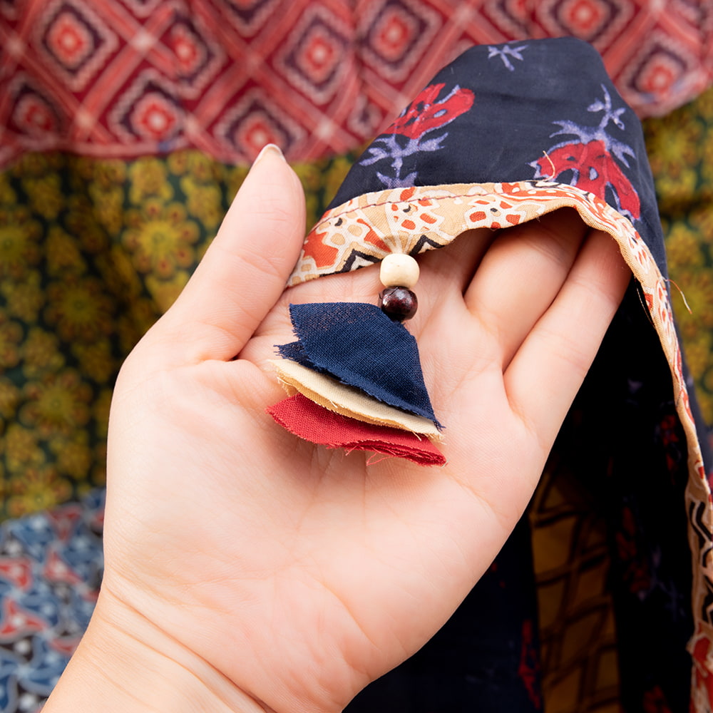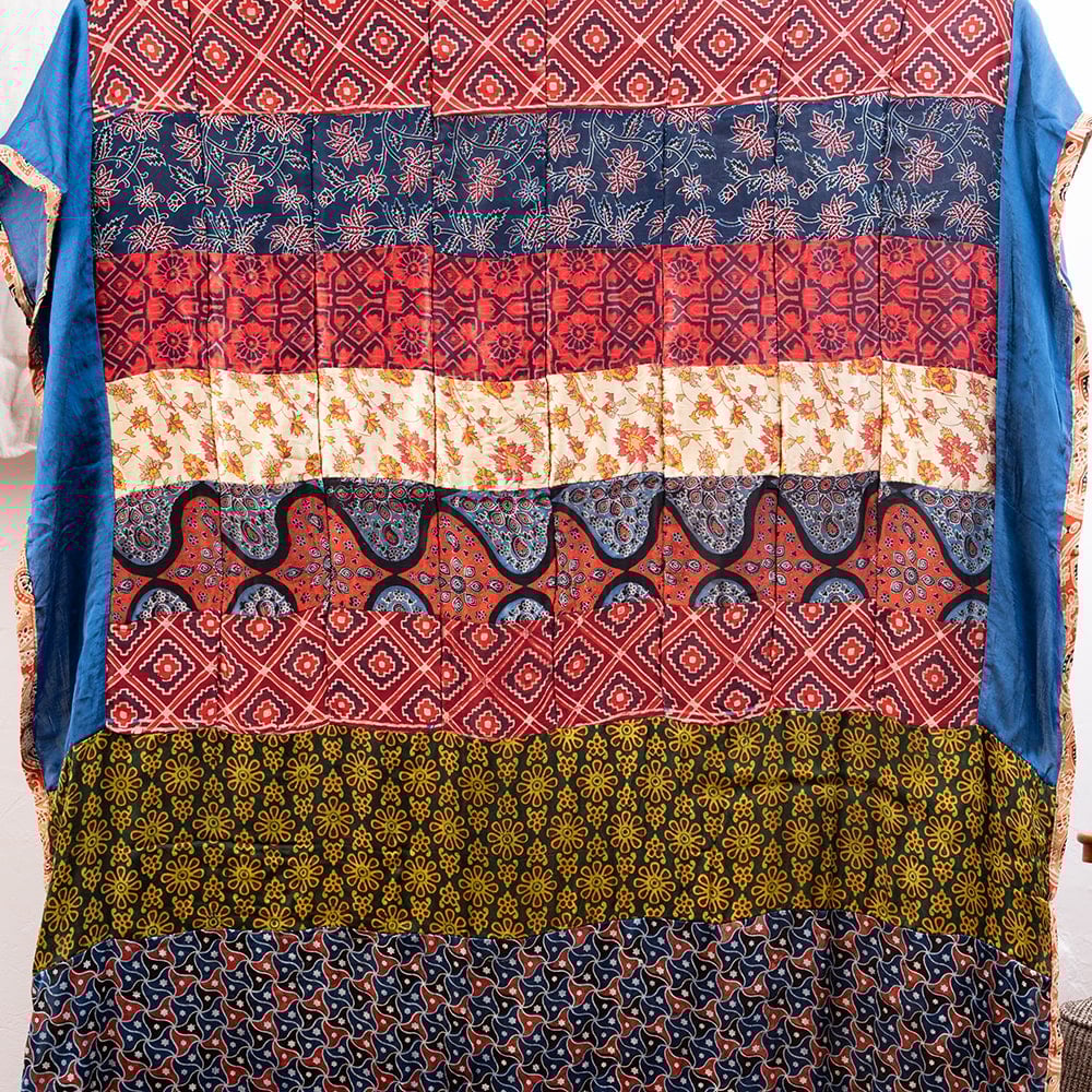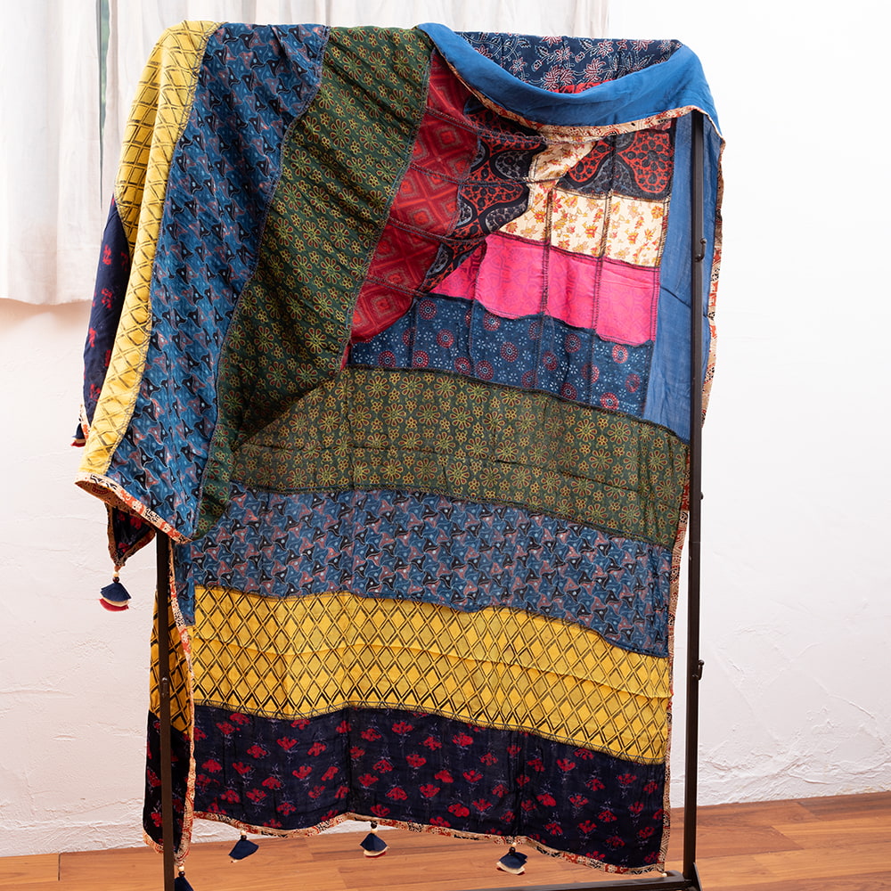アジュラックプリントやカラフルな生地を組み合わせてできたドゥパッタはすべて1点もの。生地職人がまっさらな生地にアジュラックプリントを施し、美しい生地を完成させます。出来上がった生地は縫製職人に渡り、手作業でパッチワークを作り上げています。トーンを抑えた色味、真ん中を中心に左右対称に配置された柄のおかげで、見た目よりもコーディネートしやすく使いやすいです。