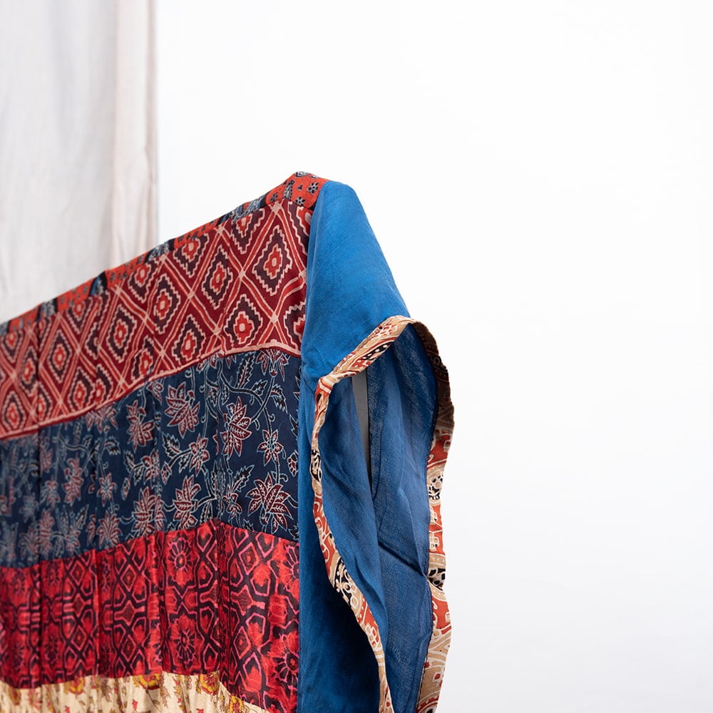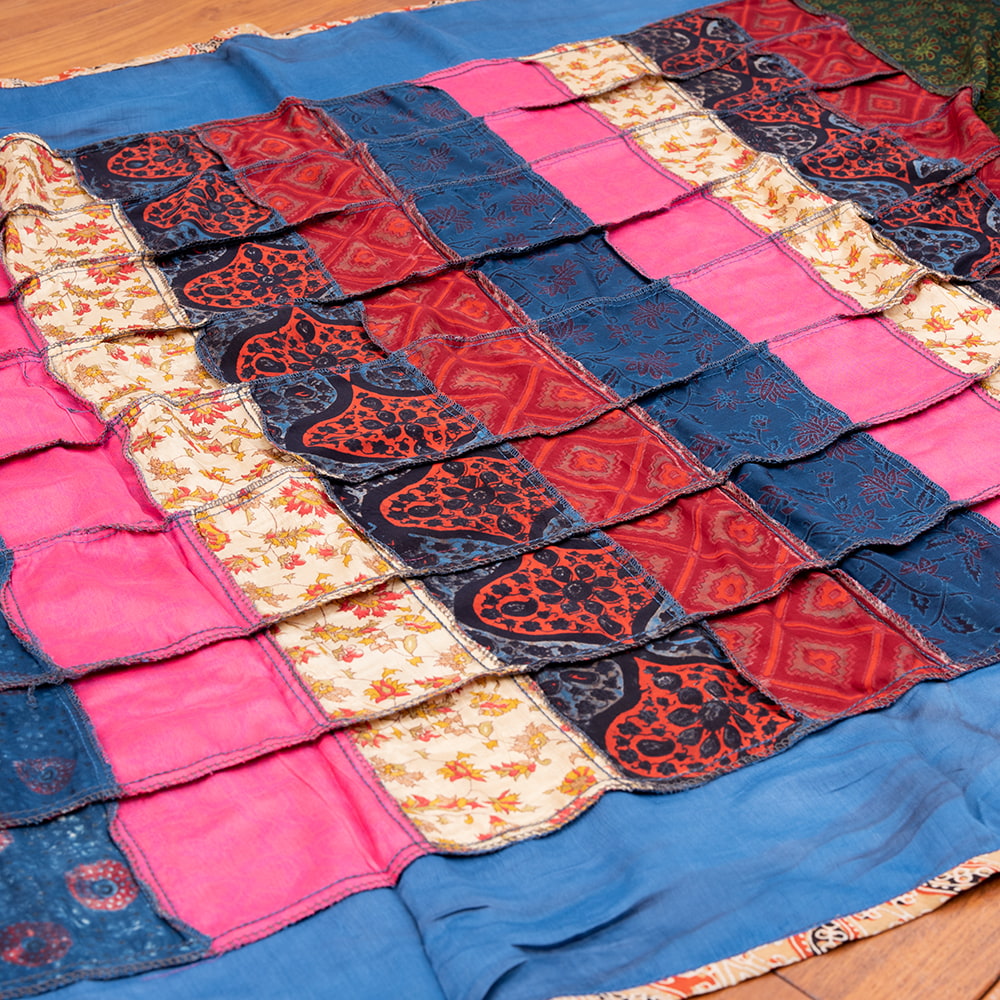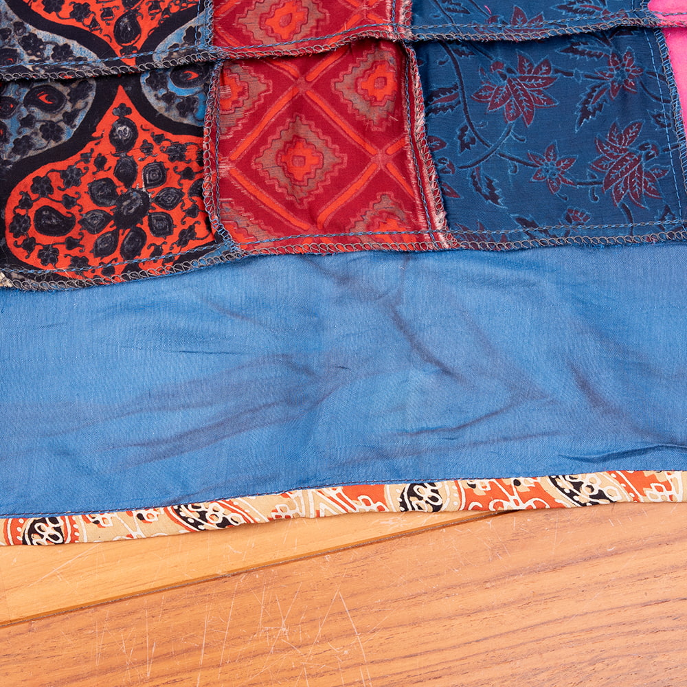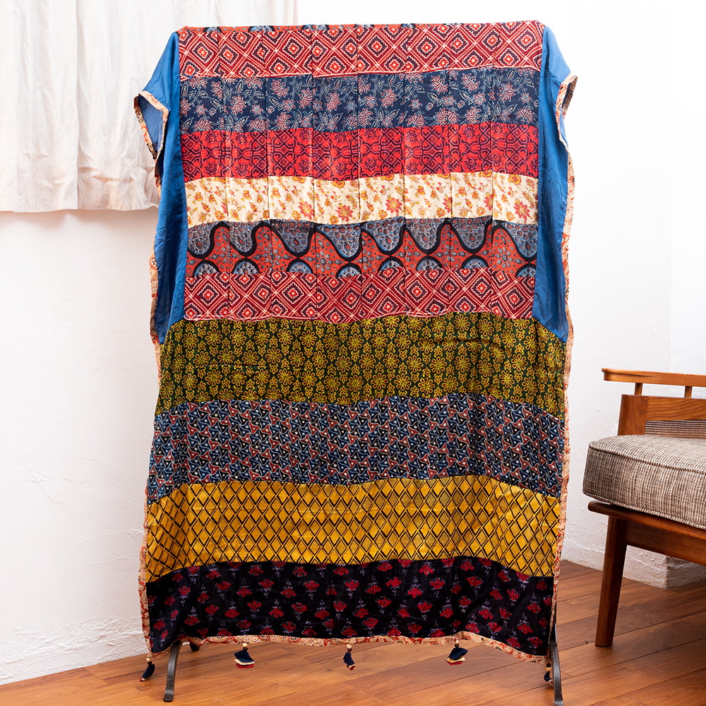 アジュラックプリントやカラフルな生地を組み合わせてできたドゥパッタはすべて1点もの。生地職人がまっさらな生地にアジュラックプリントを施し、美しい生地を完成させます。出来上がった生地は縫製職人に渡り、手作業でパッチワークを作り上げています。トーンを抑えた色味、真ん中を中心に左右対称に配置された柄のおかげで、見た目よりもコーディネートしやすく使いやすいです。