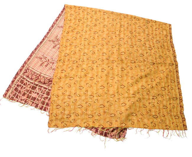 キルトのようなもう少し厚手のものをイメージしていましたが、ツルっとした生地を重ねてランニングステッチしたもので軽くてふわっとしています。全体に広げて鏡に当ててみると、光沢やグラデーションがとても上品で本当に美しいです。大きなサイズと迷い、とりあえずこちらの小さい方にしましたが、また他のも購入したいです。もう少しお安くなると嬉しいのですが。。材料にする予定ですが、このままストールとして使ってもステキですね。軽くて暖かく、重宝しそう。ステッチ糸がそのままなのもポイントになっていて可愛いです。