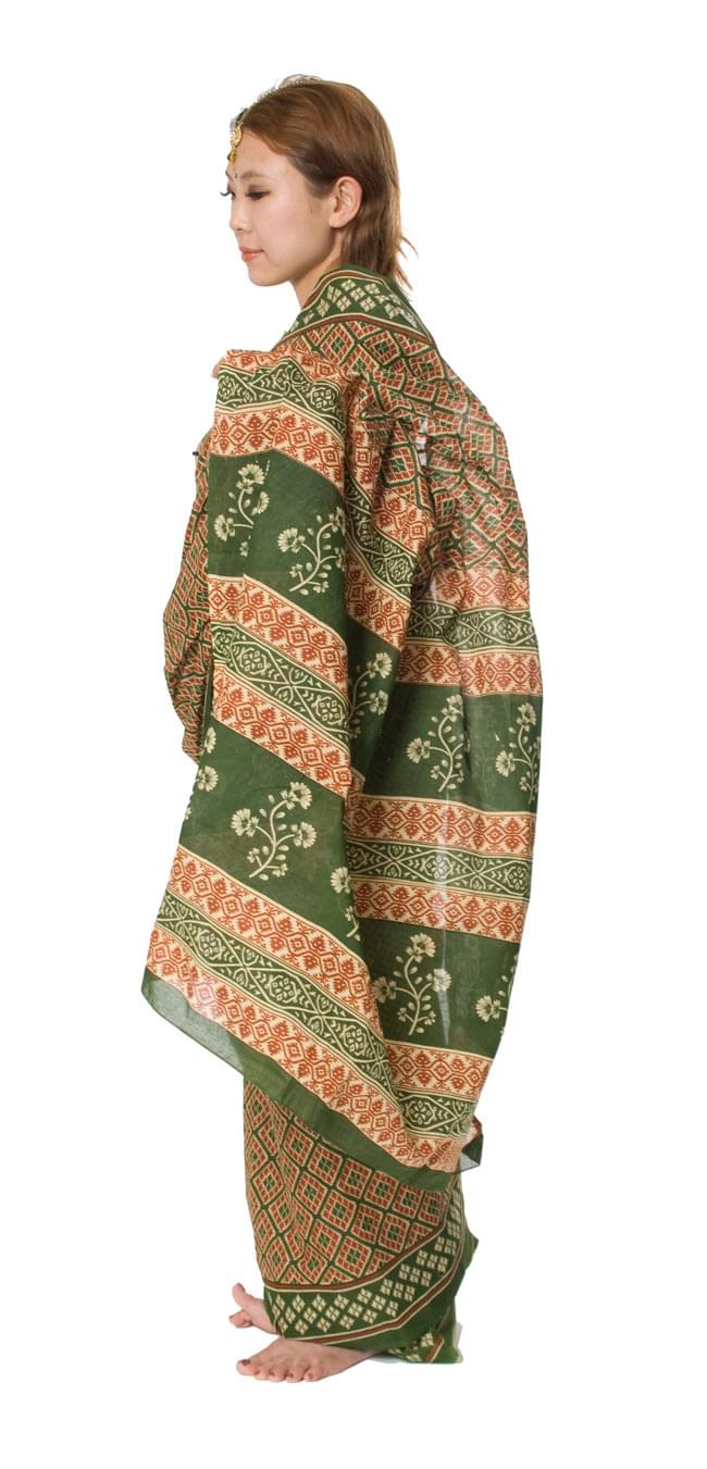 色に悩みましたがグリーンにしました。カーテンとして使おうと思っておりましたが生地がしっとり上質な綿なのでカーテンにはもったいない気がしてしまいました。デザインとしてはカーテンにもよい柄です。上質な素材なので布団のシーツにもよさそうです。よい素材なのでこれはおすすめです。チョリは布ほどしっとり感はないですがチクチクしないで着れてよかったしかわいいです。ヨガで着ようかなと思います。サリーの着方のパンフレット頂けたので試しに着てみました。最初左右間違えました。日本の着物みたいに着こなしに少し練習がいるけど着物ほど大変ではないですね。よい生地なので色違いリピートしたいです。