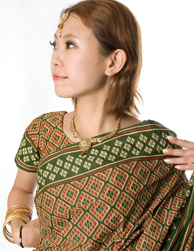 このサリーを実際に着用するとこんな感じになります。チョリもセットですのですぐに着ていただけますね。セットではなく、無地のチョリと合わせて着ても素敵です。