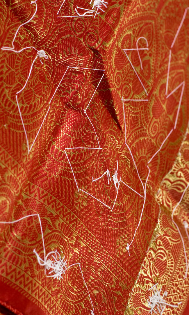 刺繍の柄が写真と若干異なる場合もございます。ご了承くださいませ。また、こちらのサリーの裏面は縫い付けた糸がそのままの状態となっております。詳細は7枚目の写真でご確認頂き、ご了承の上、お買い求め頂けますようお願い致します。