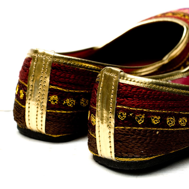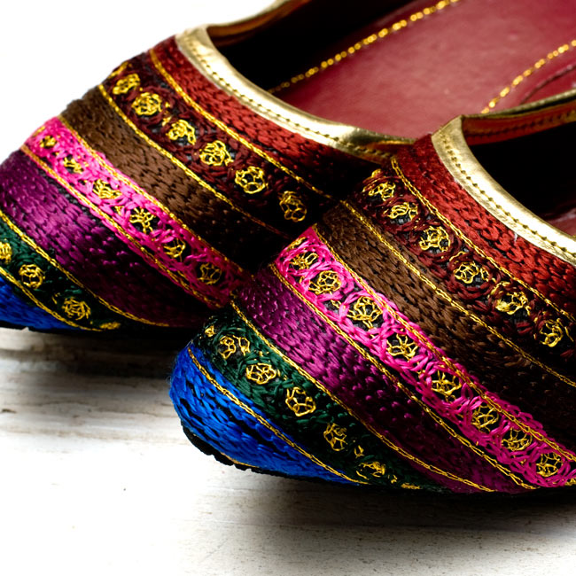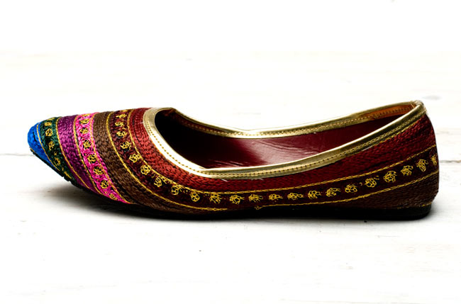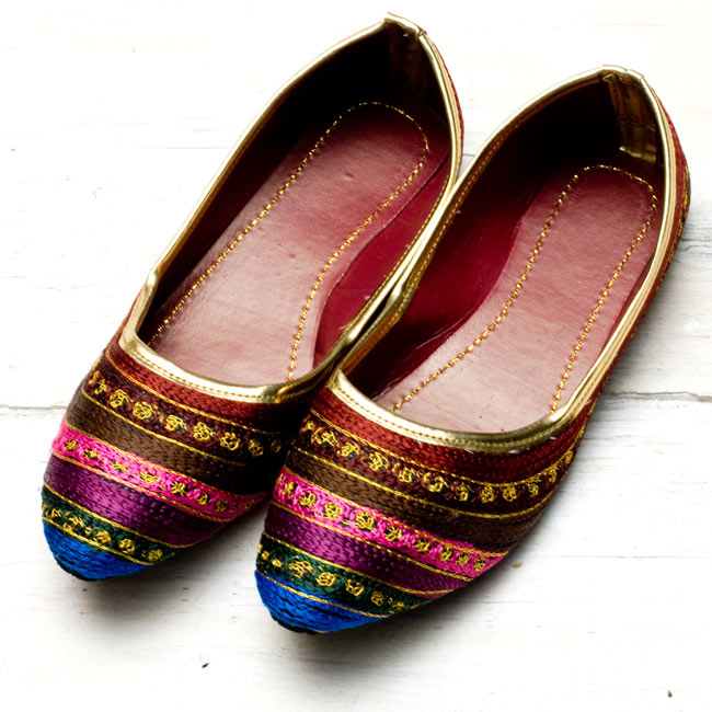 まさにインド!という華やかなフラットシューズがやって来ました。ビーズやスパンコールがキラキラと輝き、ところ狭しと刺繍が施されています。このシューズでパンジャビドレスやサリーを合わせたら、コーディネートは完璧だね!というインドスタイルです。どちらも微妙にデザインが異なりますが、どれが良いか迷ってしまうくらいバランスの取れた配色にうっとりします。インドの女性って本当に華やかなデザインが好きなんだな〜と改めて実感する一品です。エスニックファッションだけでなく、シンプルにデニムやTシャツに合わせてもかっこよく決まりますよ!