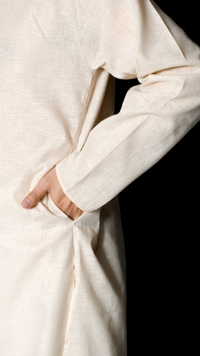 クルタ全体にこまかい地模様が織り出されています。地図記号の田んぼマークの繰り返しのような感じです。凹凸はうっすらで、刺繍とのバランスが絶妙です。ポケットは着た時の右側のみにありました。深さは14センチで使いやすい大きさです。
