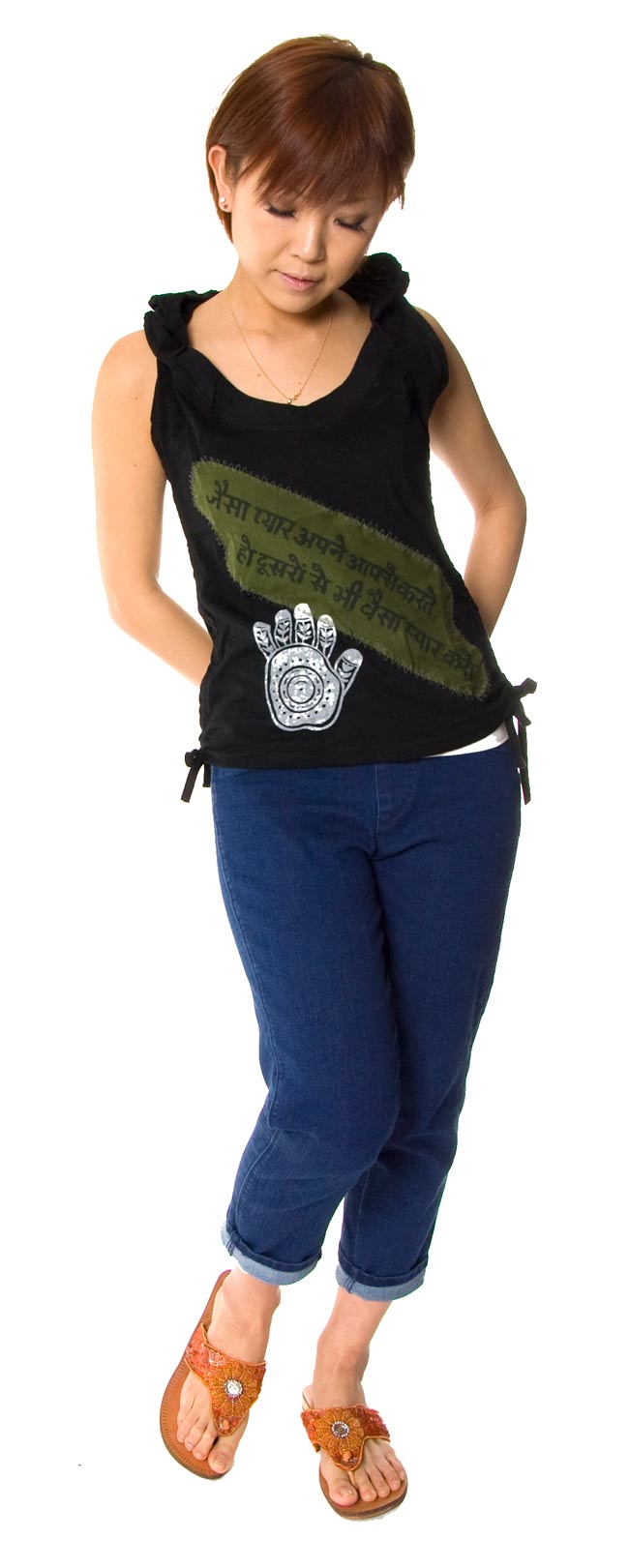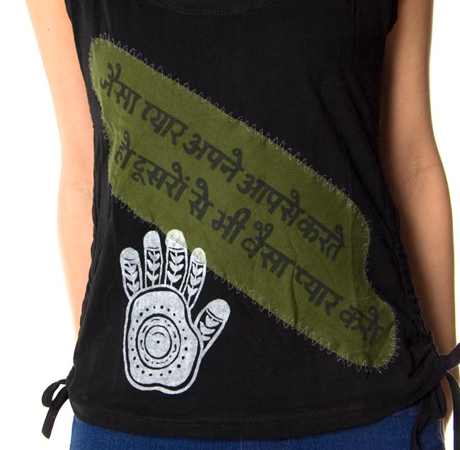 このタンクトップはそのメヘンディをデザインとしてあしらった一枚。ヒンドゥー語も入っているタンクトップです。ヒンドゥー語の意味ですが、『how much you love your self, For other also you love same much』という意味のようです。
