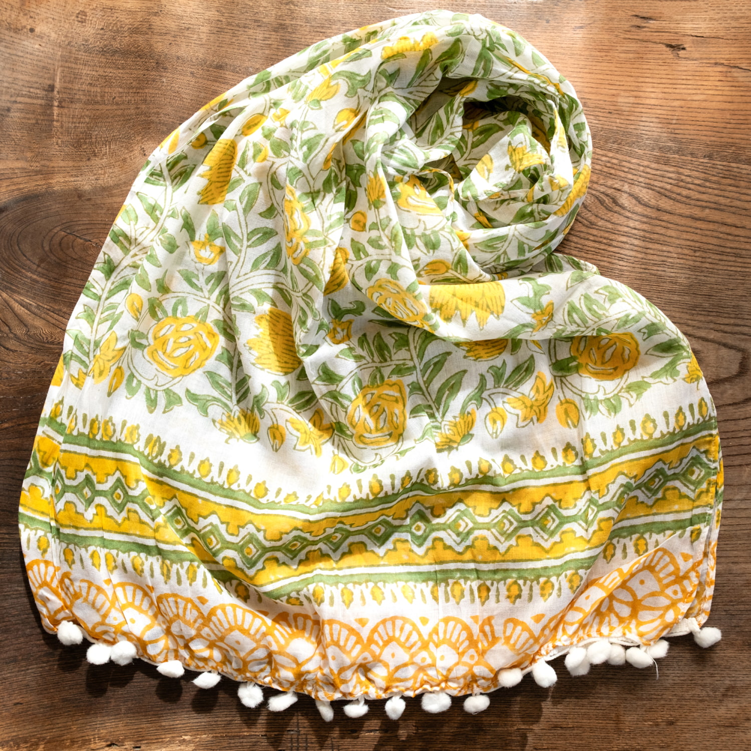 ウッドブロックの柄が可愛い雰囲気のあるインドのストールです。光に当たると透け感があり非常に軽やかです