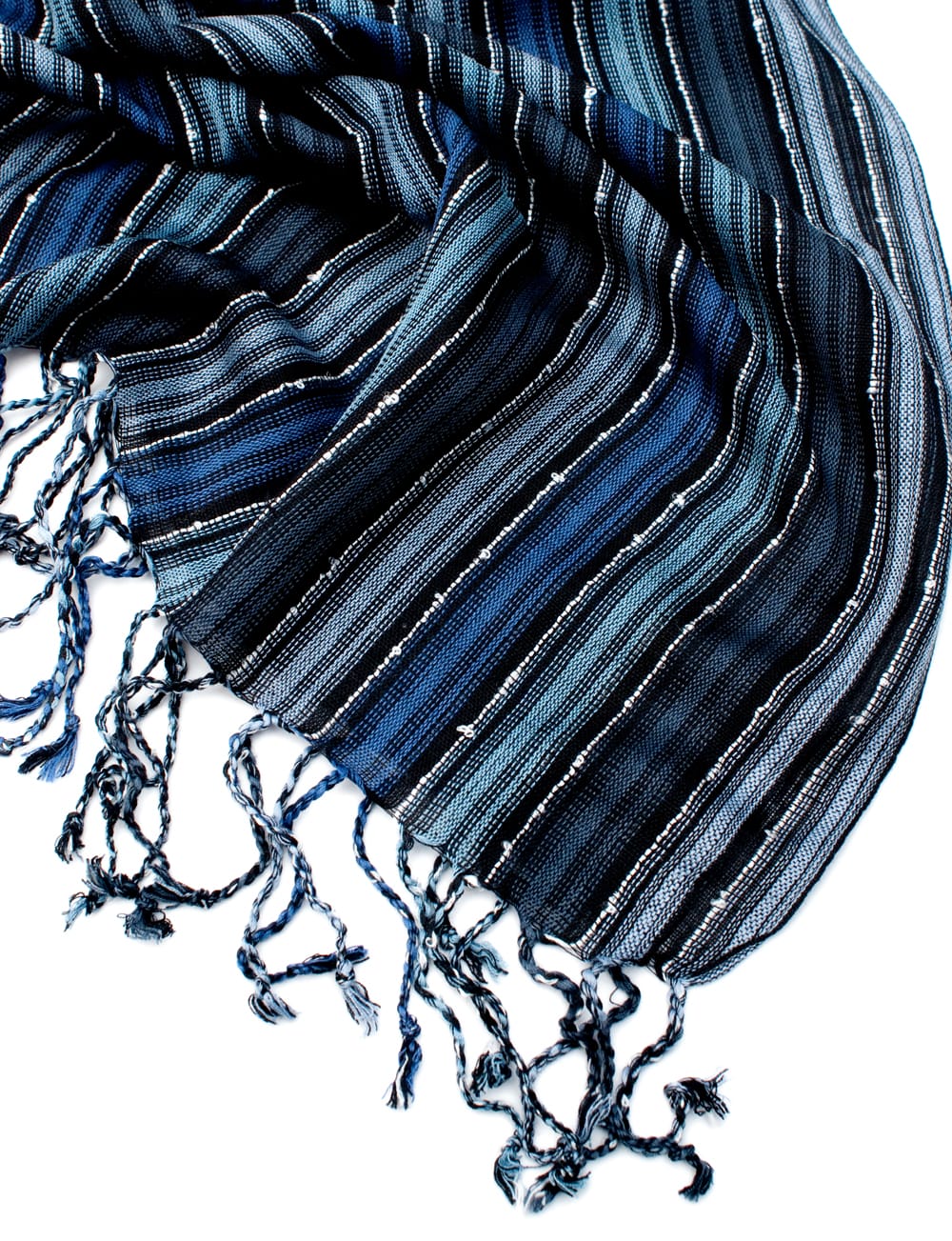 ストールとして少し肌寒い季節や、夏の冷房が効きすぎた室内で使うもよし、部屋のインテリアとして飾るもよし、頭に巻いてみたり、ベルトにしたりと、用途は多彩、発想しだいで何でも使える便利な布です。