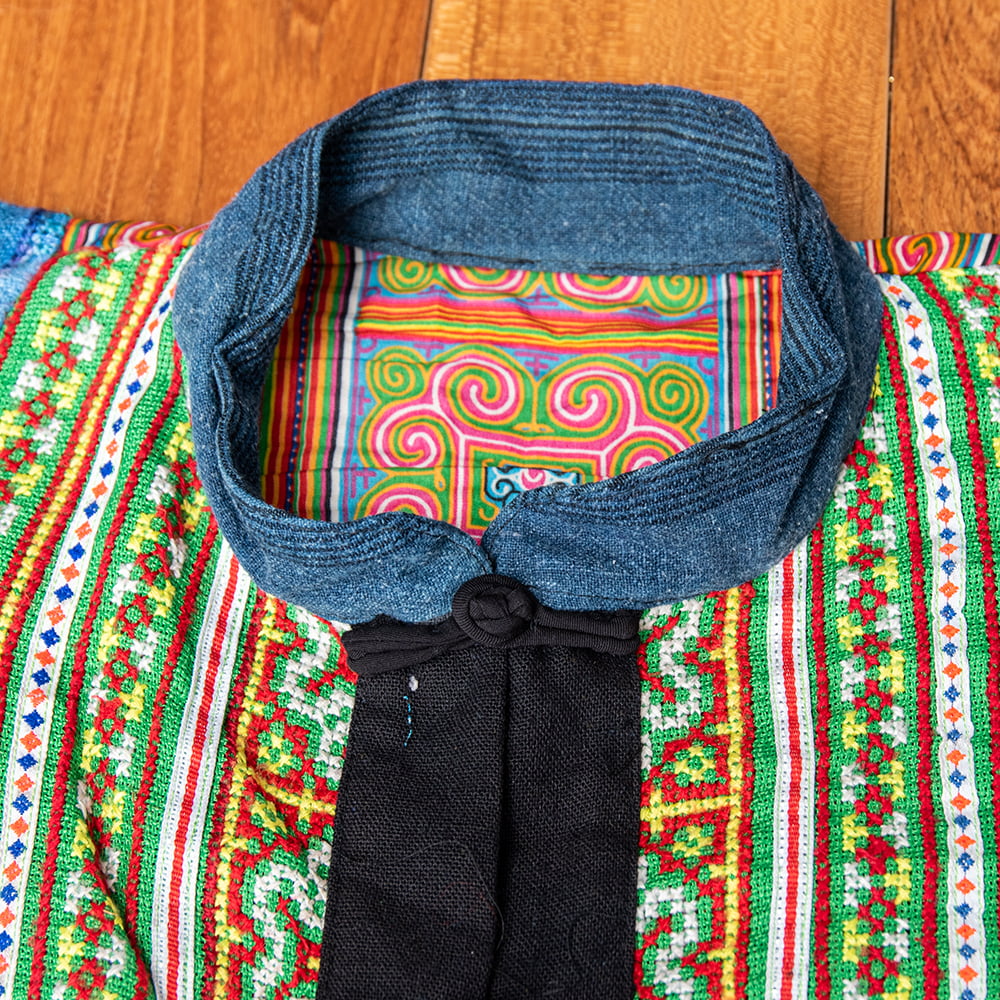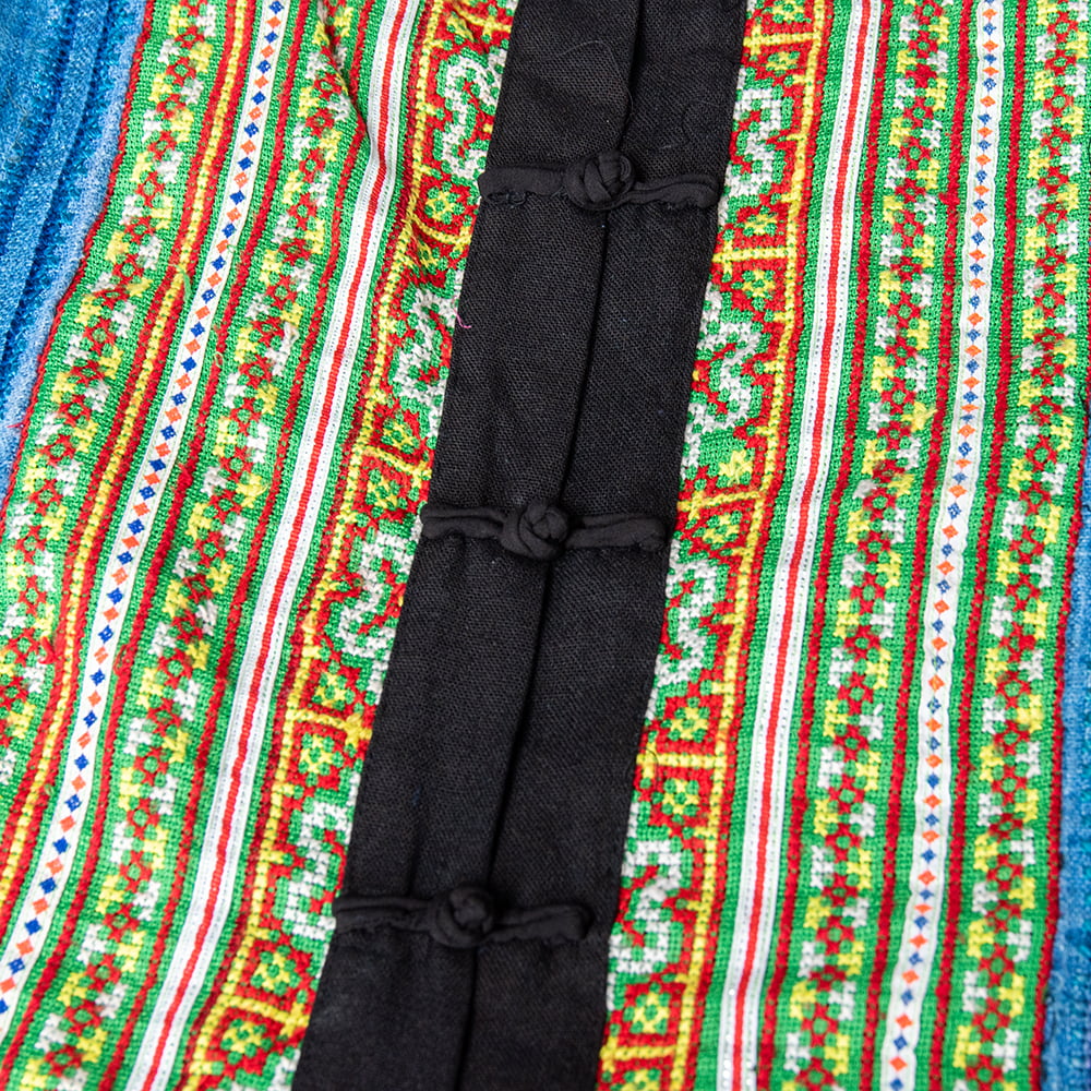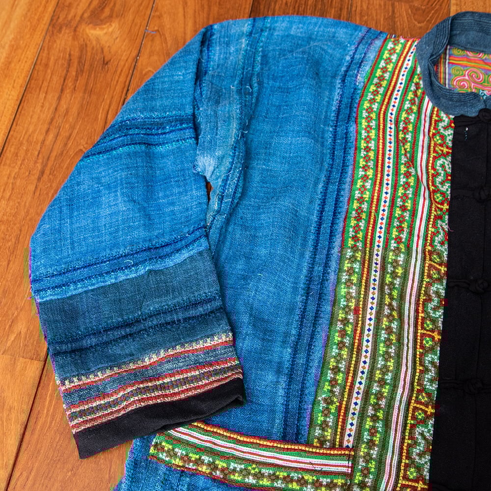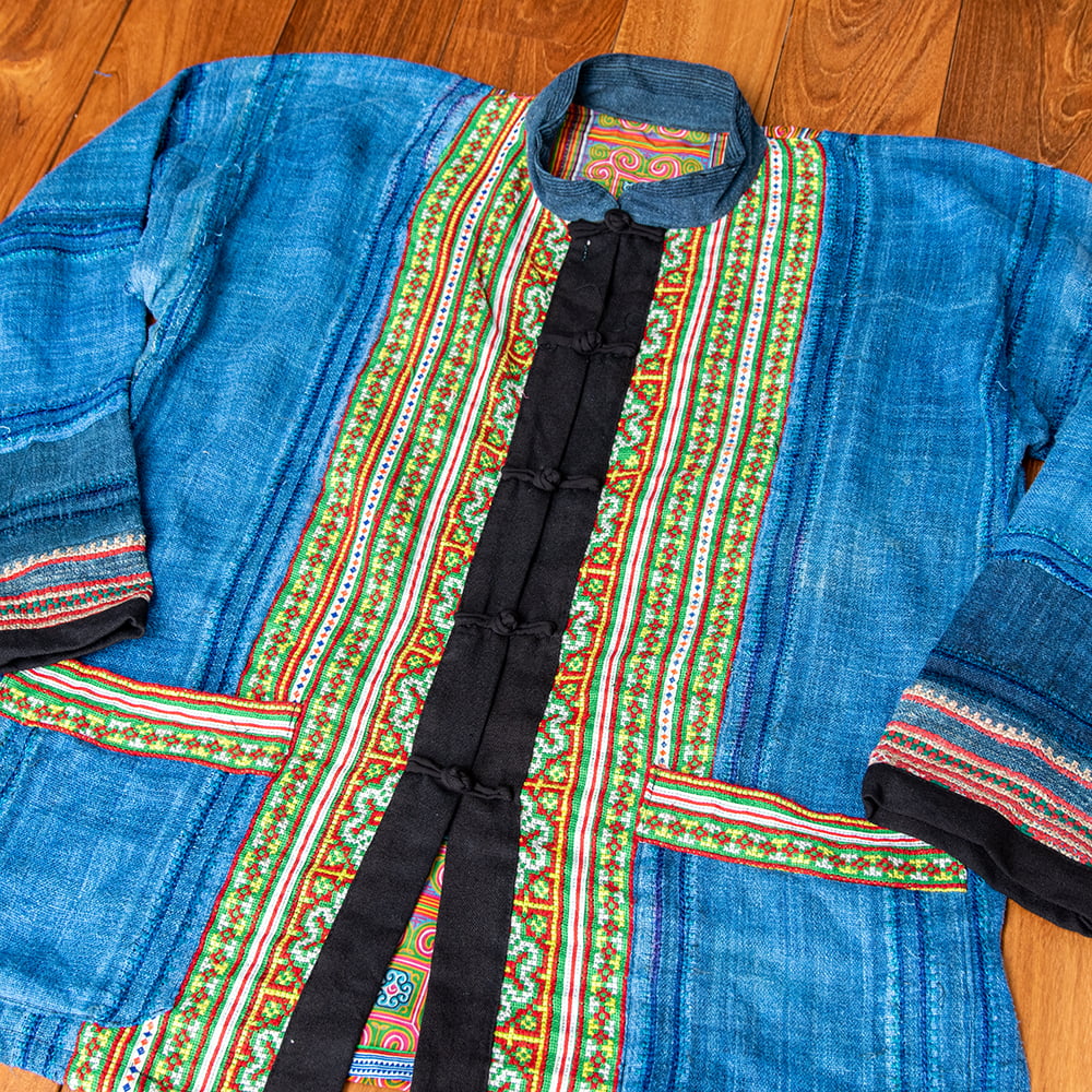 ベトナムの黒モン族が手作りした、伝統的な藍染刺繍ジャケットです。美しく染められた藍染の生地に、モン族の色鮮やかな刺繍を組み合わせています。職人さんが一点ずつ手作りしているので、ジャケットはそれぞれ一点物。手作りのぬくもりを感じる、素敵なジャケットです。ジャケットの生地は春〜秋用くらいの厚み。通気性もあり蒸れにくい生地感で、夏場でも涼しい地域の、山間などでは使えそうです。サイズはゆったり目なので、中に着込むこともできます。