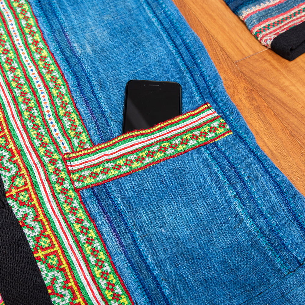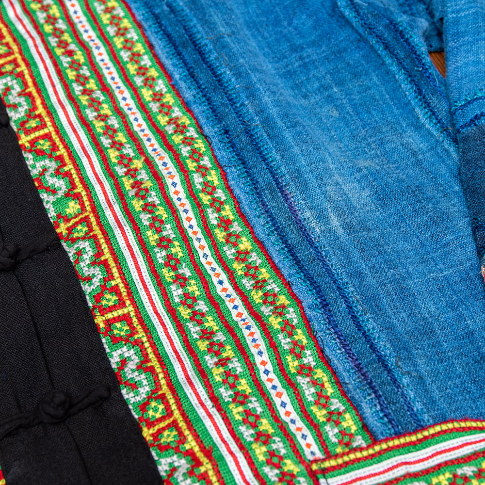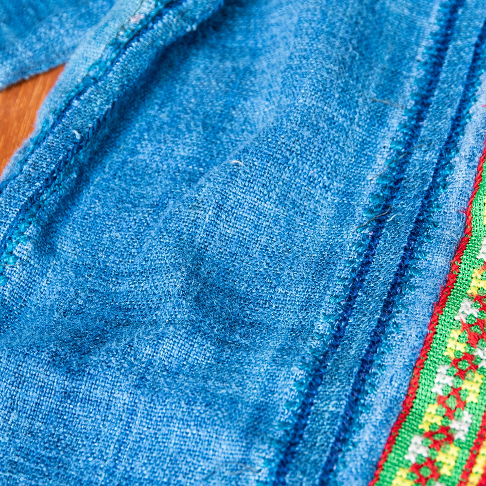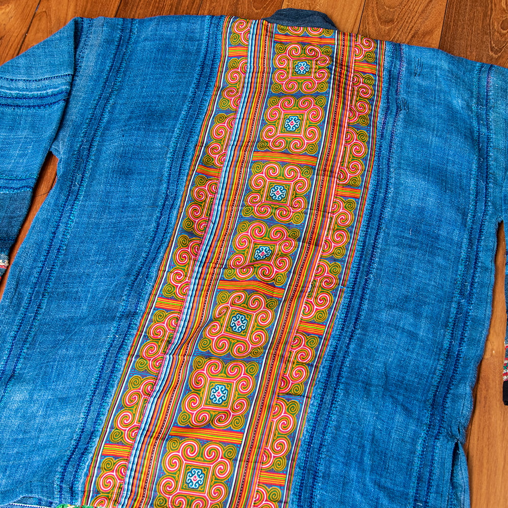 ベトナムの黒モン族が手作りした、伝統的な藍染刺繍ジャケットです。美しく染められた藍染の生地に、モン族の色鮮やかな刺繍を組み合わせています。職人さんが一点ずつ手作りしているので、ジャケットはそれぞれ一点物。手作りのぬくもりを感じる、素敵なジャケットです。ジャケットの生地は春〜秋用くらいの厚み。通気性もあり蒸れにくい生地感で、夏場でも涼しい地域の、山間などでは使えそうです。サイズはゆったり目なので、中に着込むこともできます。