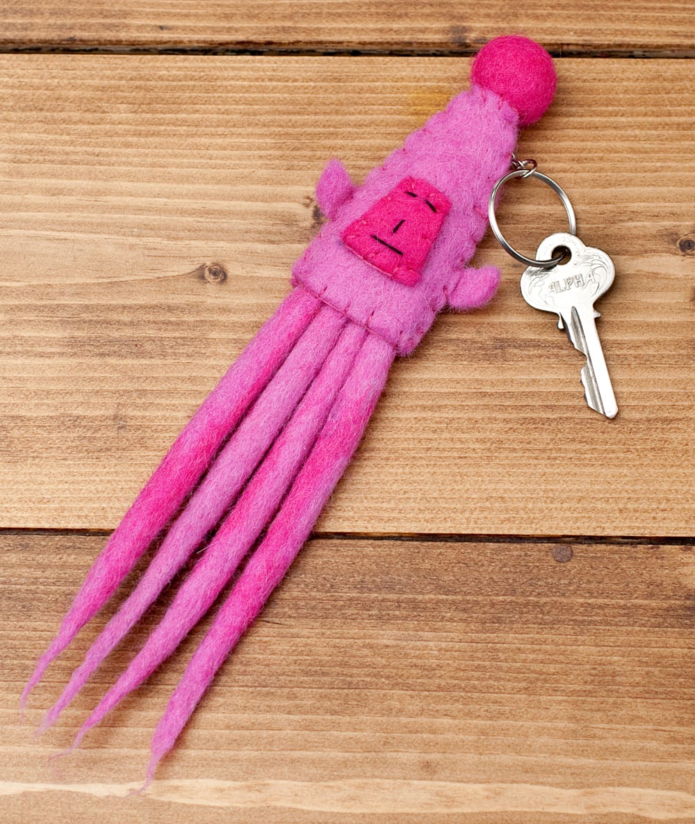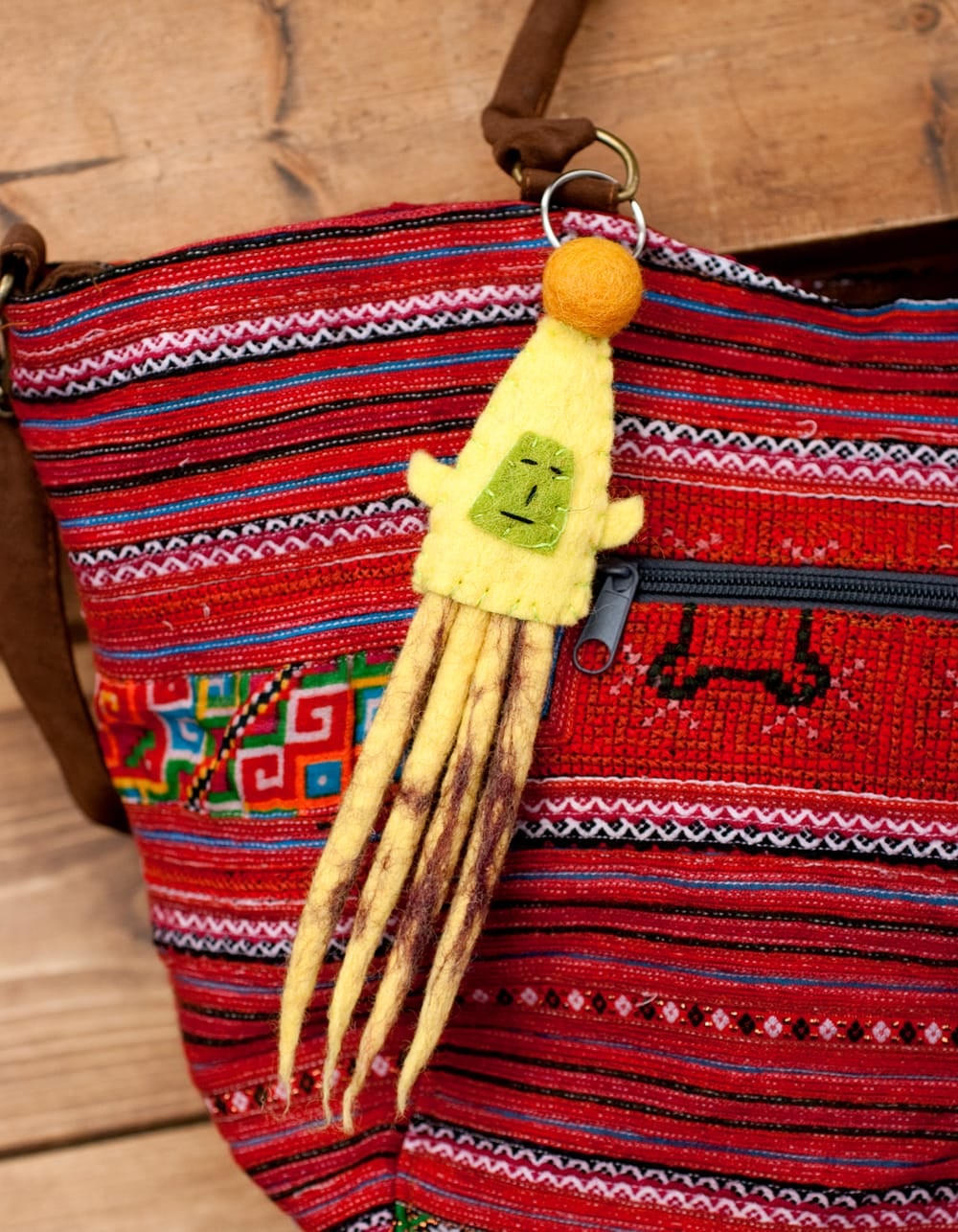 商品名には「イカ」と書いたのですが、実はなんだかよくわからないゆるキャラです。ネパールからやってきた時の商品名を見てみると「フェルトふろっぐ キーホルダー」と書いてありましたが…どこからどう見てもカエルではないですよね。よく見てみれば、愛着が湧いてきそうな、ニヒルな顔にすらっと背の高く何を模しているのかわからない容姿。貴方の携帯電話につけたり、バックや鍵につけて、貴方の相棒にいかがですか。目を引く事まちがいなしですよ。
