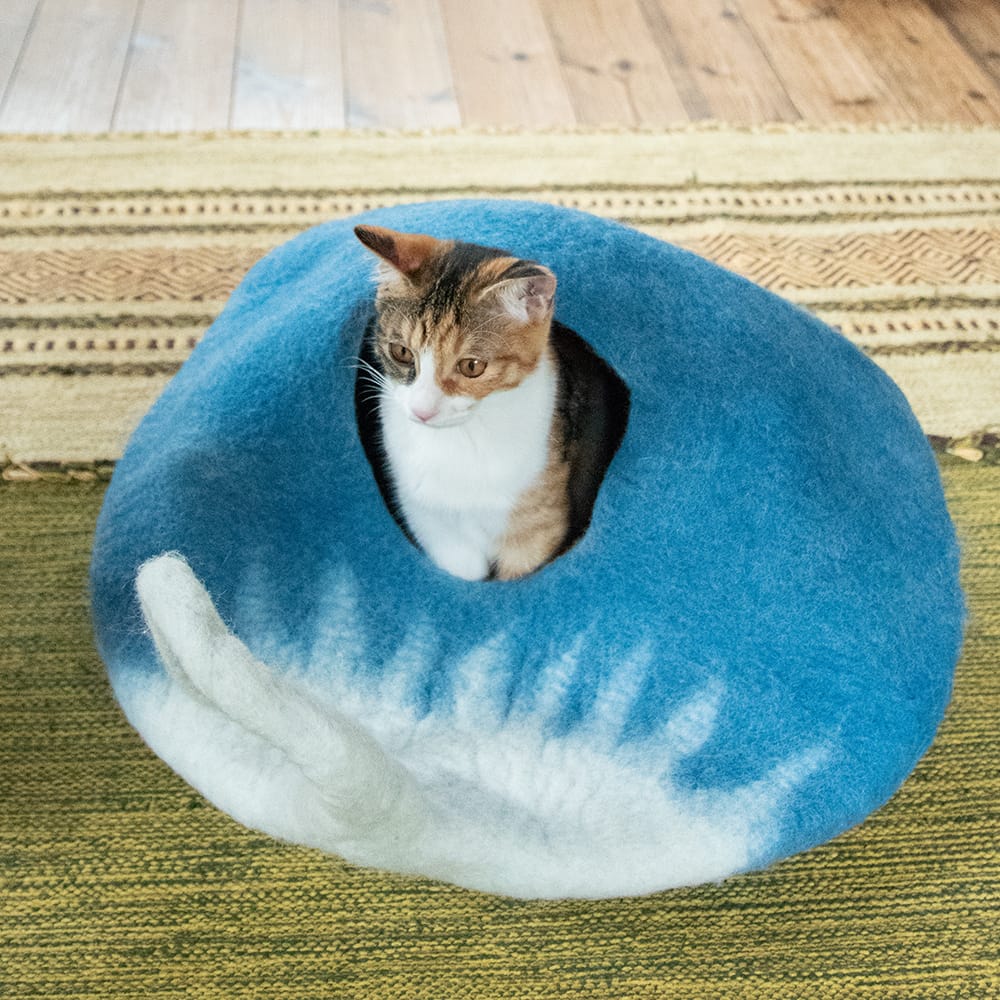 ウェットフェルト製法という特殊な方法で手作りされており、継ぎ目もなく、糸で縫ってもいない、完全なウール製品です。全部がウールでできているので、夏は暑くなりすぎず、冬は保温性が高く猫ちゃん自身の体温であたたかい、とても居心地のいいハウスです。一回入り込んで気に入ってしまうと、何があっても出てこようとしない子もいるくらいですよ!
