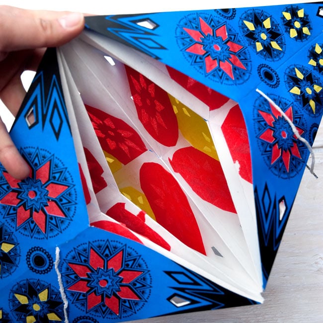 インドクオリティとのことでしたが、思った以上にしっかり作ってあると思いました。開く時はワクワクドキドキですね。幾つか購入したのですが、一つ目は加減が分からず紐を強く引っ張り過ぎて、紐が外れそうになりましたが、ゆっくり開けばノープロブレムです。食堂兼雑貨屋をやっているので、雑貨コーナーに飾ったところ、一気にインド感が増して大満足です!