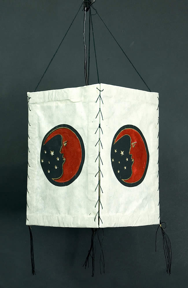 アジアンなロゴがプリントされたロクタ紙製のランプシェード。