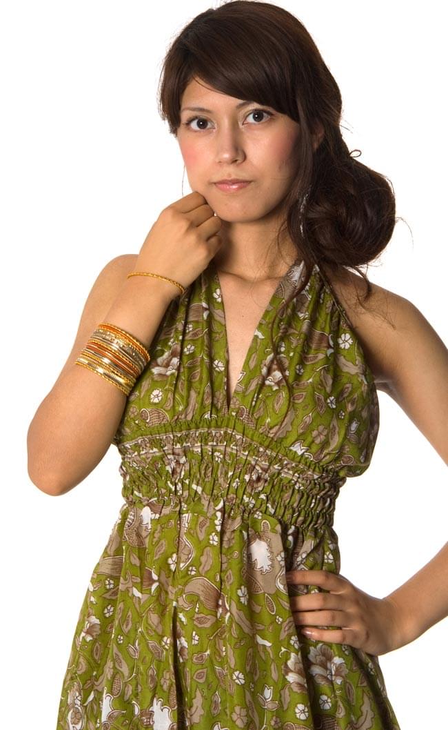 リサイクルオールドサリーを使った商品ですので、1点1点異なり世界で1枚だけのワンピースです。光沢がある素材で、光の当たり具合によって色が変化します。