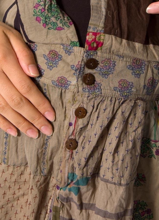ウエスト部分にボタンがついて、ローウェストのデザインで腰回りがゆったりしているので、着心地抜群!リゾート地で水着の上にさっと着ていただくなんてどうでしょうか?女性らしいデザインで可愛らしく柔らかい印象が素敵ですね。インドらしい柄のパッチワークも個性的です。