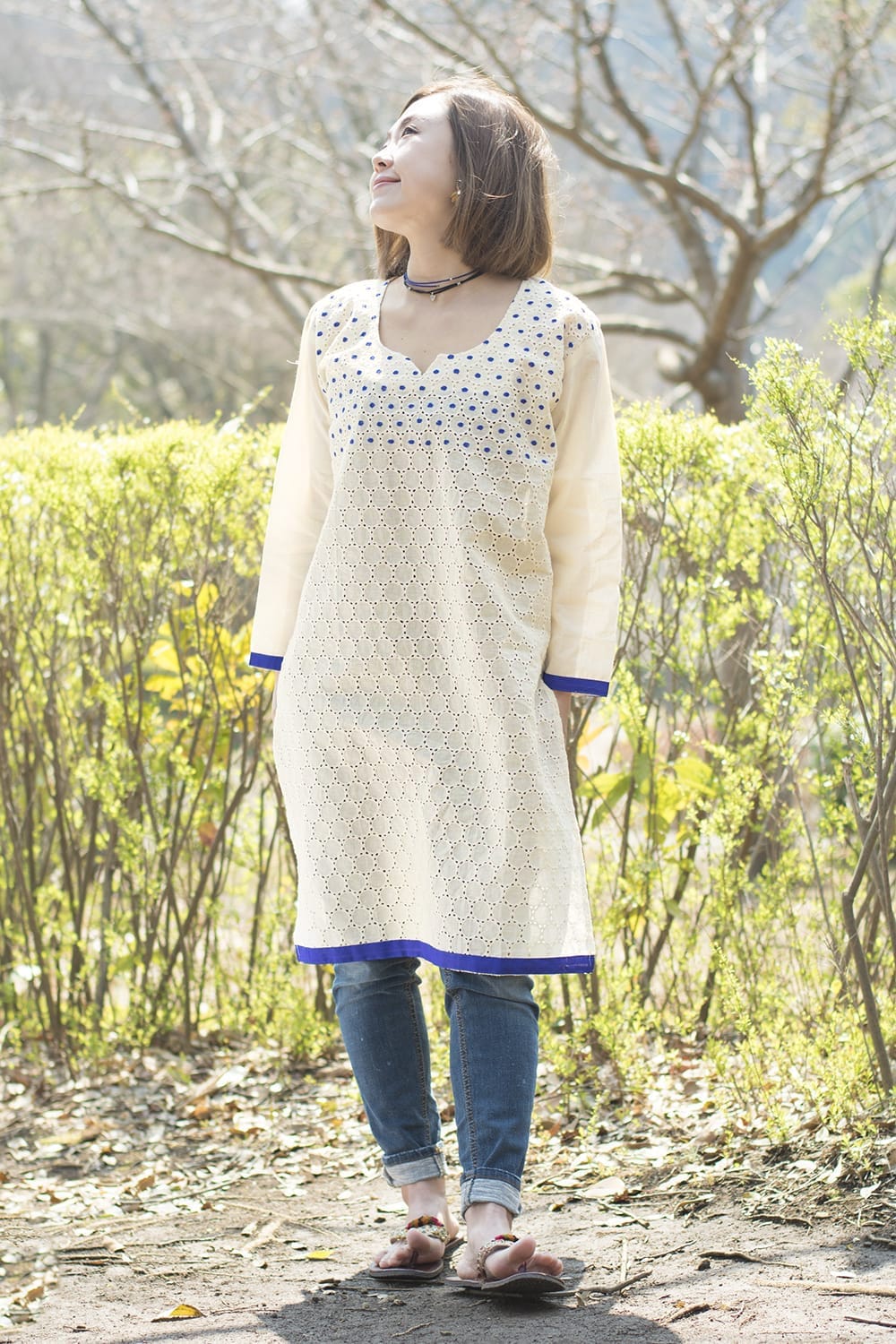 インナー付きが嬉しい!ホワイトドット生地の刺繍クルティ