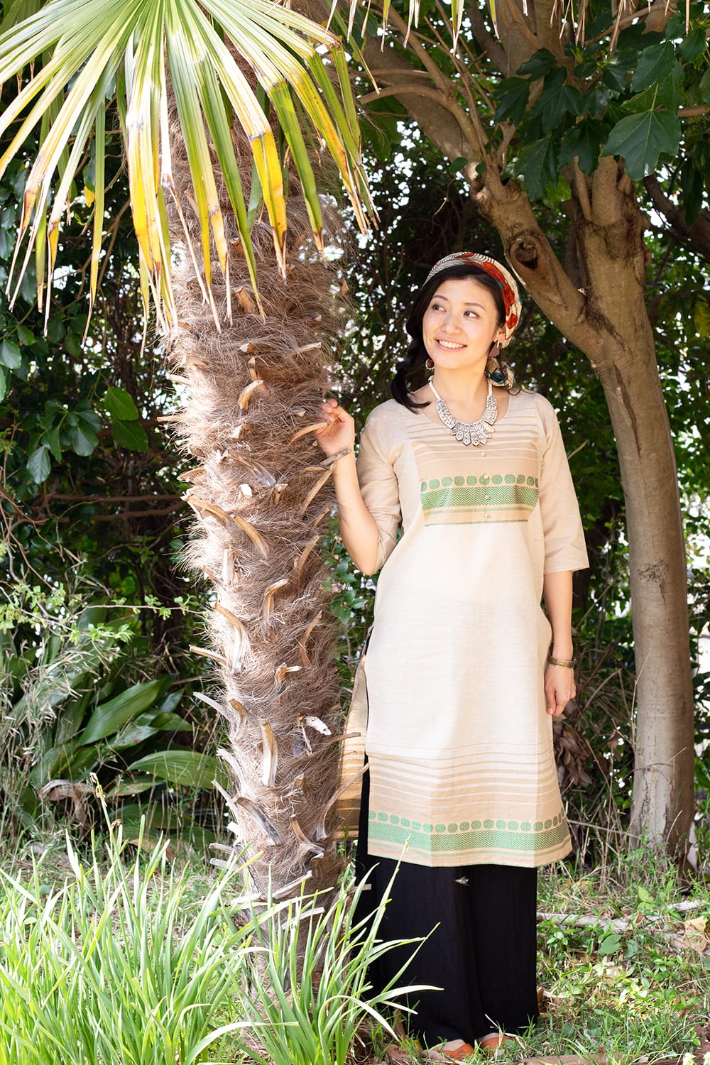 派手めの色合いが多いインド服ですが、こちらは普段着にも使える落ち着いた生成り生地の自然な色合いです。裾口のボーダー飾り(「ザリ」と呼ばれています)が華やかで、すらりとしたシルエットに良く映えます。ボタン風の飾りもキュートですね。| ブランド | TIRAKITA ( ティラキタ ) |
