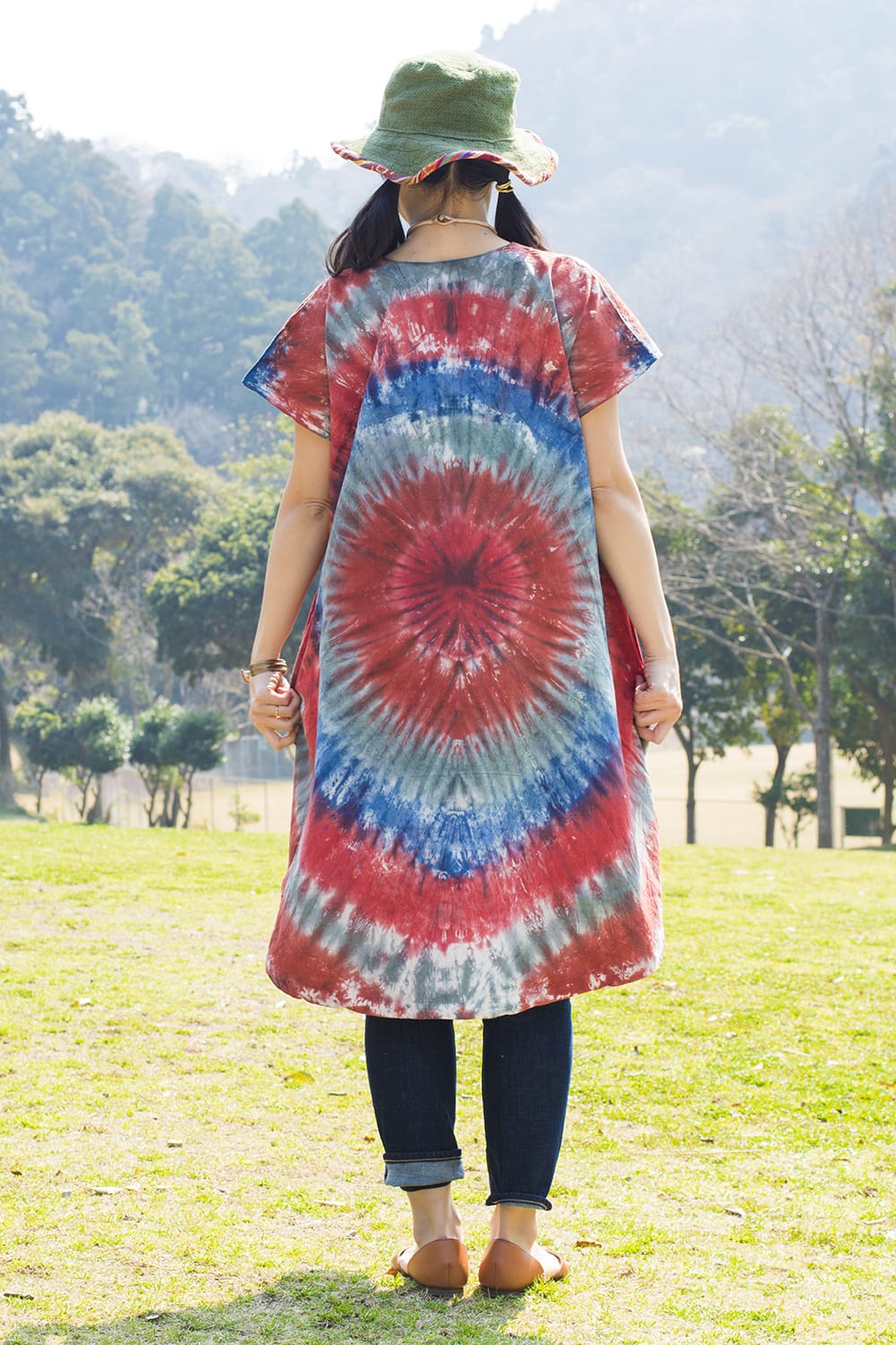 全面をタイダイ染されたワンピースです。アイリス(虹彩)柄にタイダイが映えて、前横後ろどこからみてもカラフルな色合いでファンキーに着こなせそう。野外のイベントやフェスでも目立つことまちがいなしです♪■しっかりコットン地でオールシーズン◎