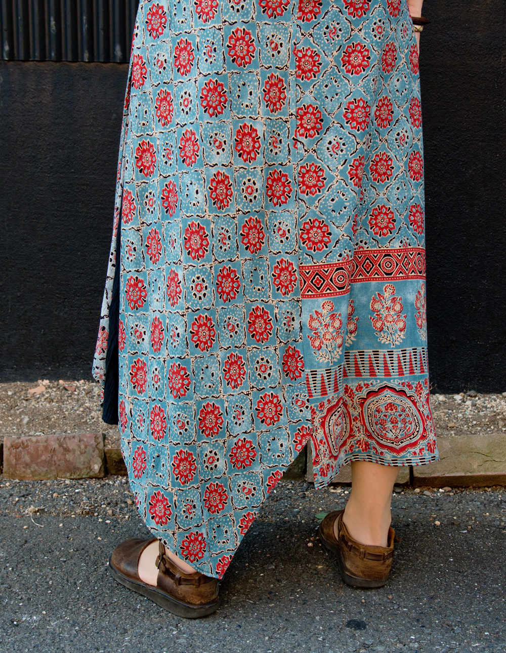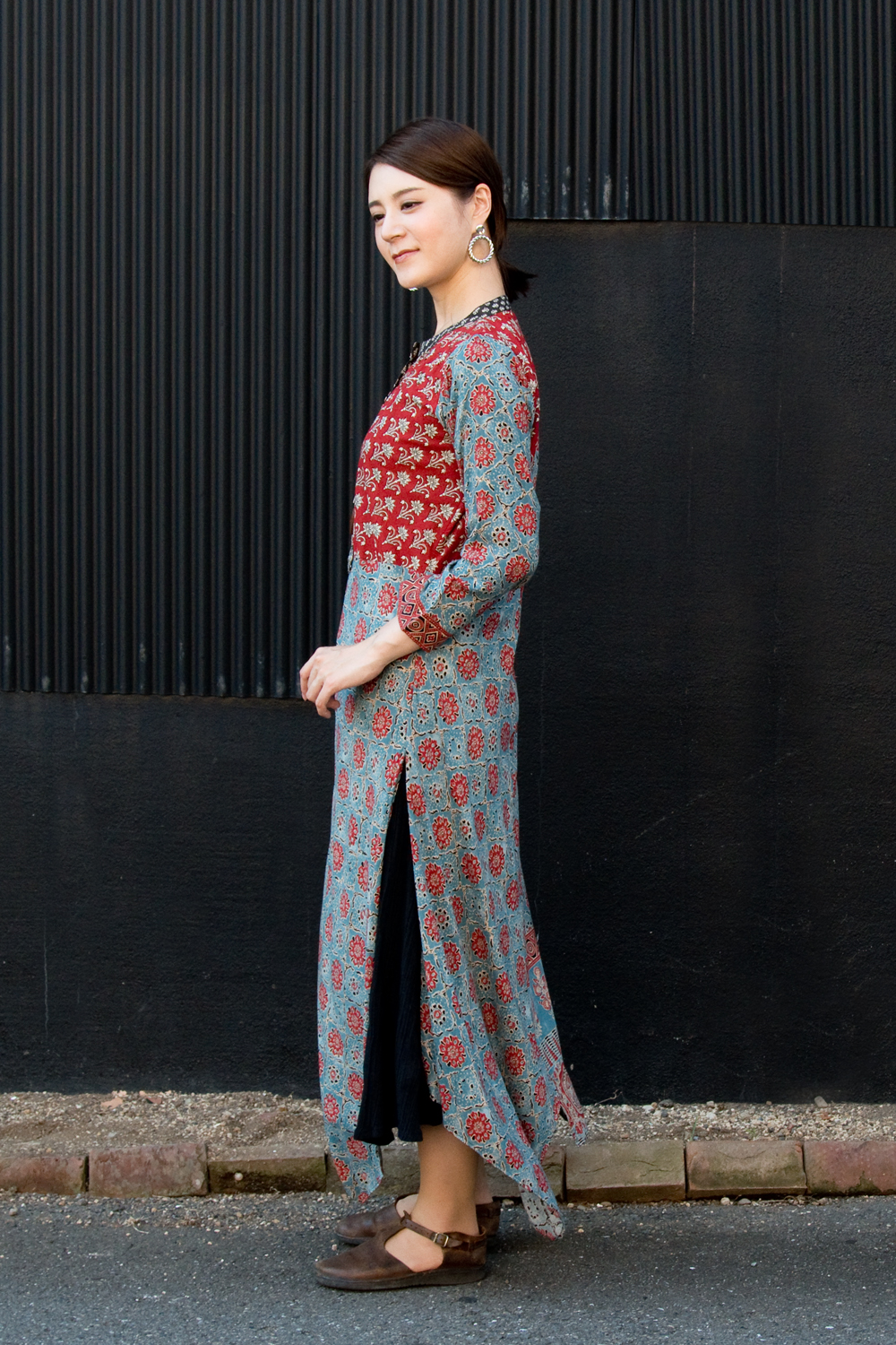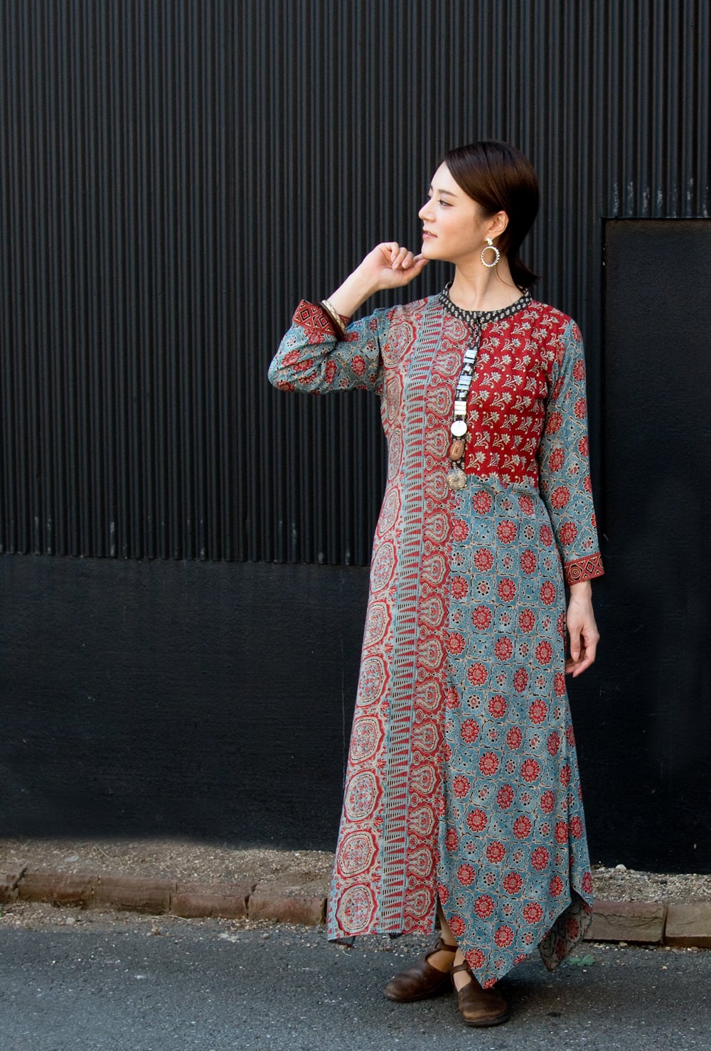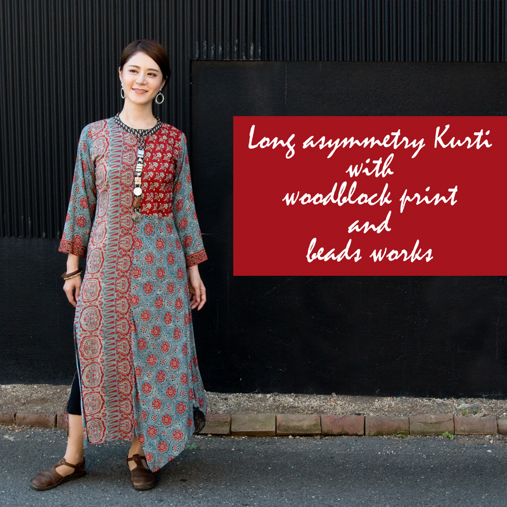個性派ボタンが可愛い!ウッドブロックプリントのアシンメトリー ロングクルティ 通販店