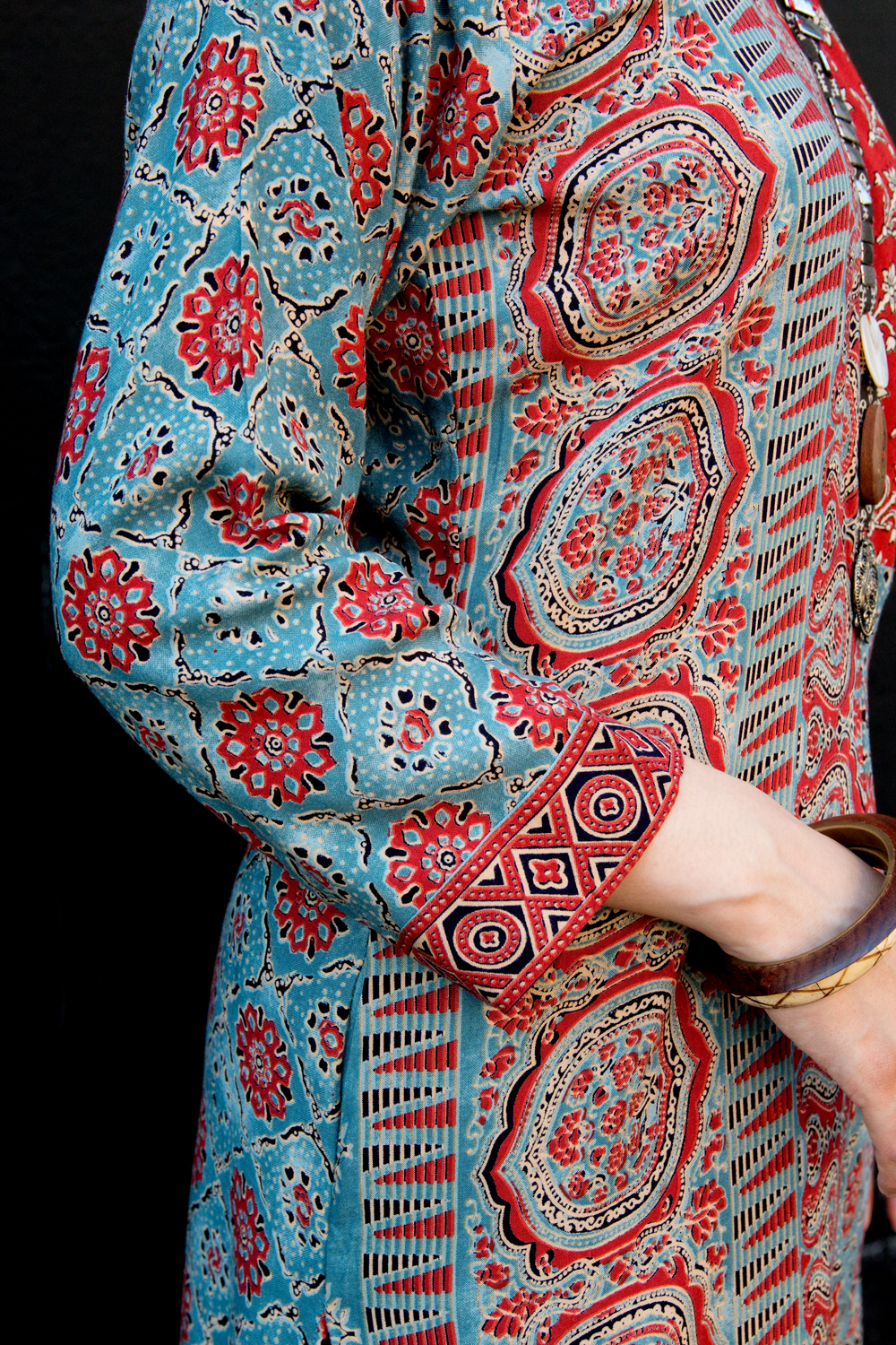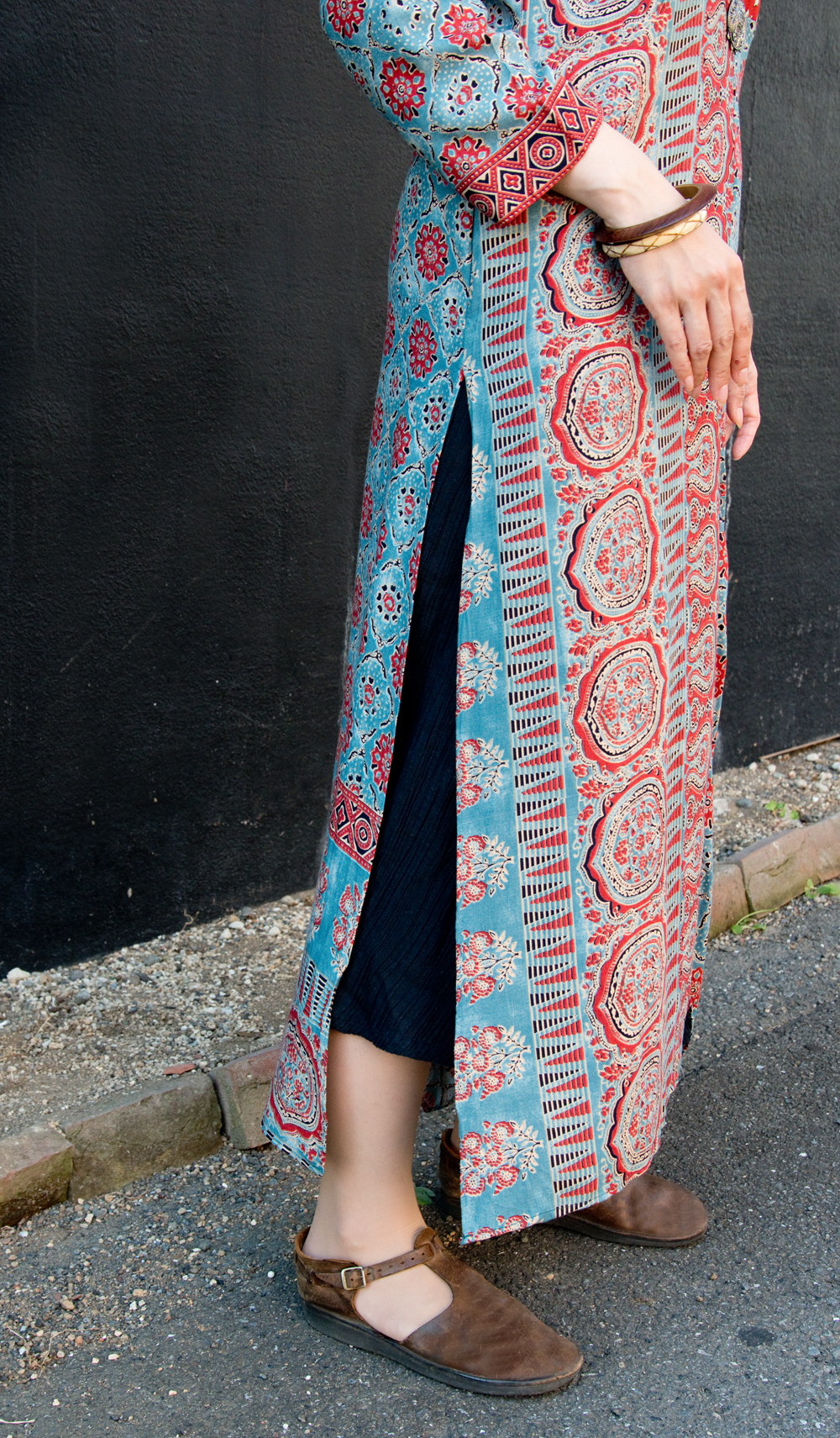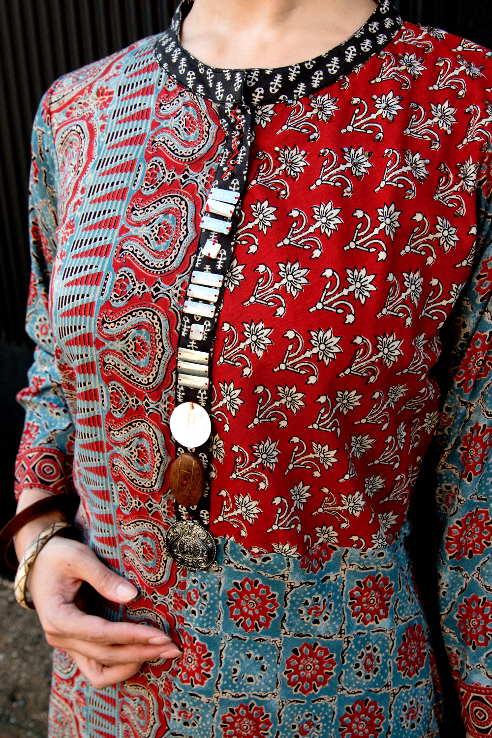 個性派ボタンが可愛い!ウッドブロックプリントのアシンメトリー ロングクルティ 通販店