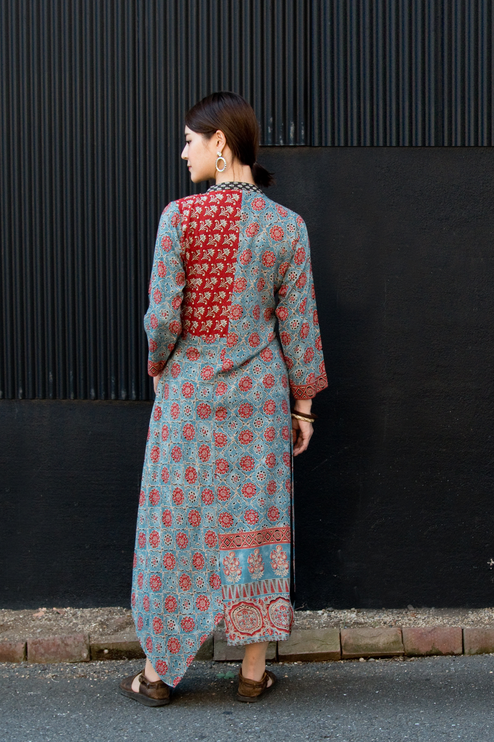 個性派ボタンが可愛い!ウッドブロックプリントのアシンメトリー ロングクルティ