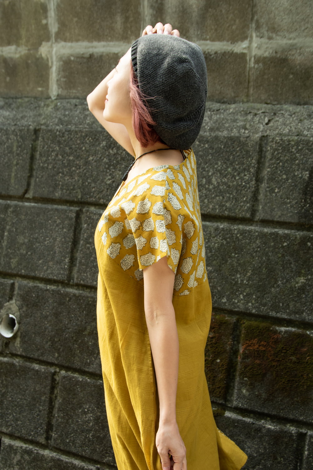 ドビー織りのコットン生地とウッドブロックプリントを合わせたデザインのワンピースです。ドビー織りとは連続した幾何学模様に織られた生地のことで、サラサラした肌触りが心地よく、暑い季節に適した織物です。顔周りのウッドブロックプリントが表情を明るく彩ってくれます。■ゆったりフリーサイズのデザインです