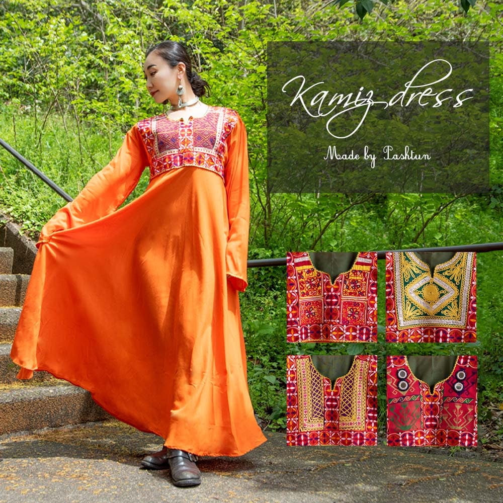 【全て1点もの】 パシュトゥーン族の伝統衣装 カミーズドレス ロング 【オレンジ】 通販店