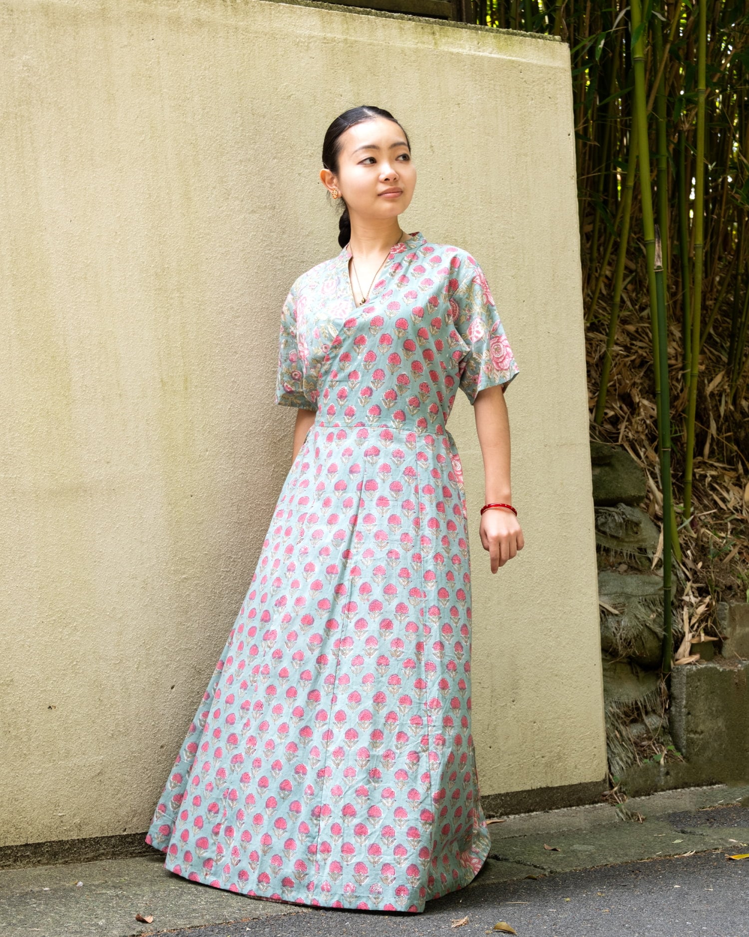 ウッドブロックプリントの布をふんだんに使用した贅沢な一品です。すっきりしつつ女性らしいデザインが美しいです。