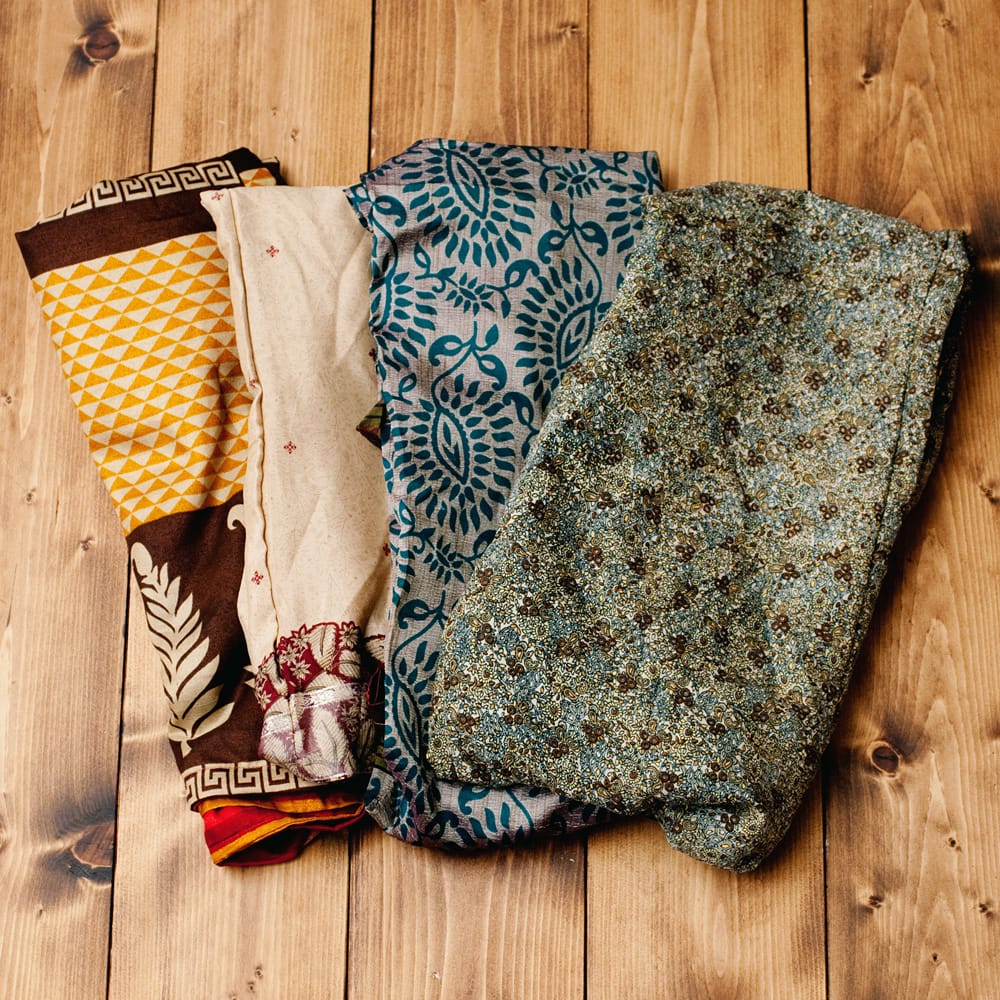 また、パンツの素材へは、アンティークサリーを使用しておりますので、それぞれが完全に一品物となっております。色ごとにまとめておりますので、大体どういう物が届くかは例として四枚のパンツを並べた、参考画像をご覧ください。また、写真と異なる商品が届く場合もございます。