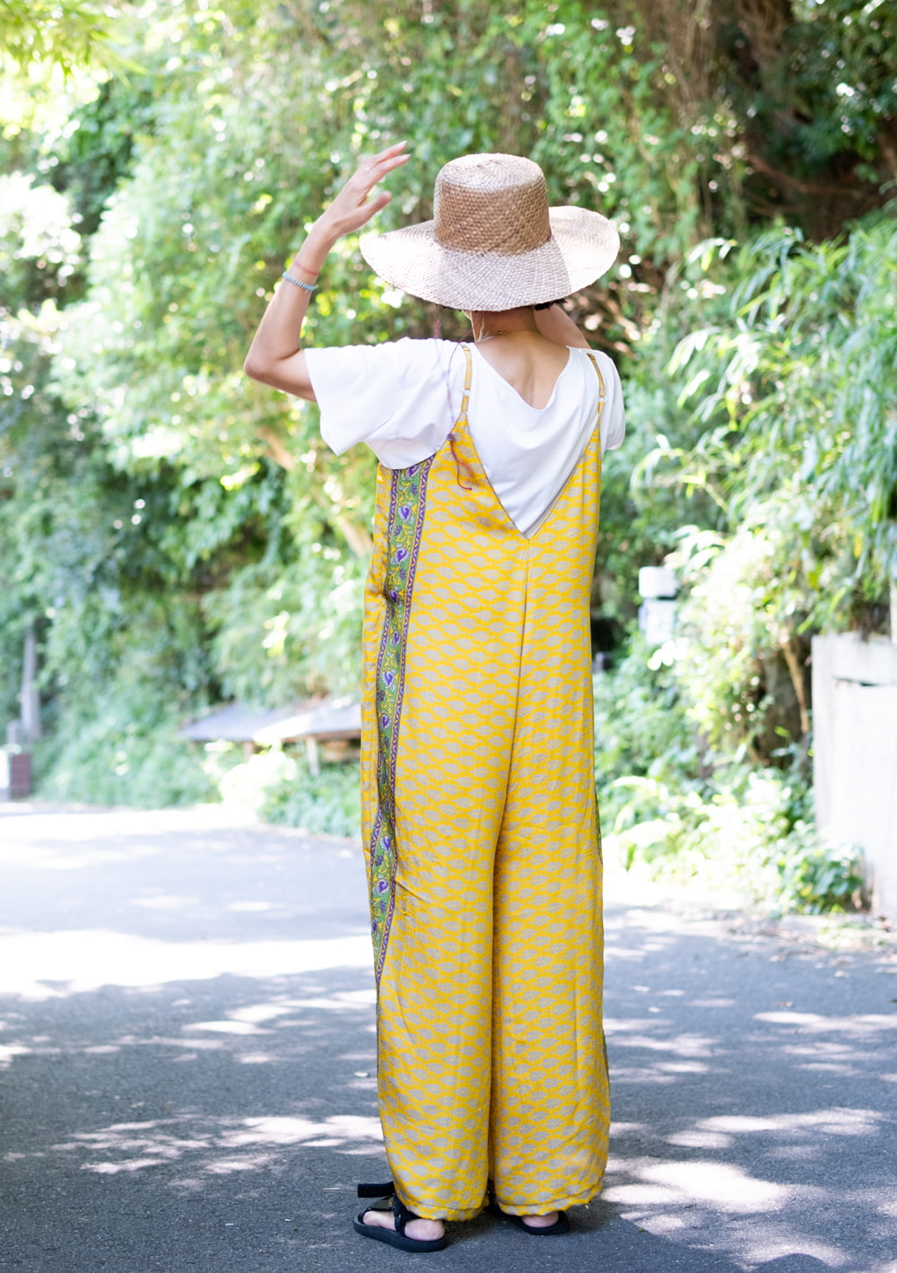 リサイクルオールドサリー使用したスッキリデザインのサロペットです。 ロング丈ではありますが、軽いのでとにかく履き心地最高です。まるで何も履いていないみたいだね?とティラキタスタッフの間でも盛り上がりました!リラックスして履けるので、室内着からちょっとした外出、野外フェスまで何でもこなしてくれて重宝しますよ。
