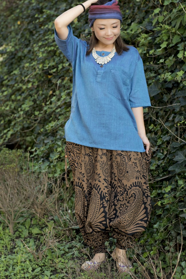 今回、<黒×薄茶>のお色味を購入しました。派手好きの私は同商品の<黒×ライム>も持っていて、あれはあれで気に入っているのですが、他の皆さんの多くがこの<黒×薄茶>を購入される理由がやっと解りました。この<黒×薄茶>、何にでも合いますね。そして、何を合わせてもエスニック感が出る!しかも自然な感じにエスニック感が出る…というお色味。この商品のラフな着心地は癖になりますし、このお色味の「アジアン・テイスト感」は、エスニック初心者にもエスニック上級者にも満足いくものと思います。「エスニックというお洒落」の入門編のモモンガパンツだと思います。モモンガパンツに抵抗のある方でなければ、失敗感のかなり少ないお色味だと思います。