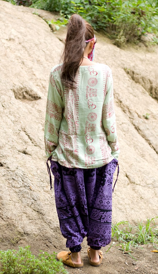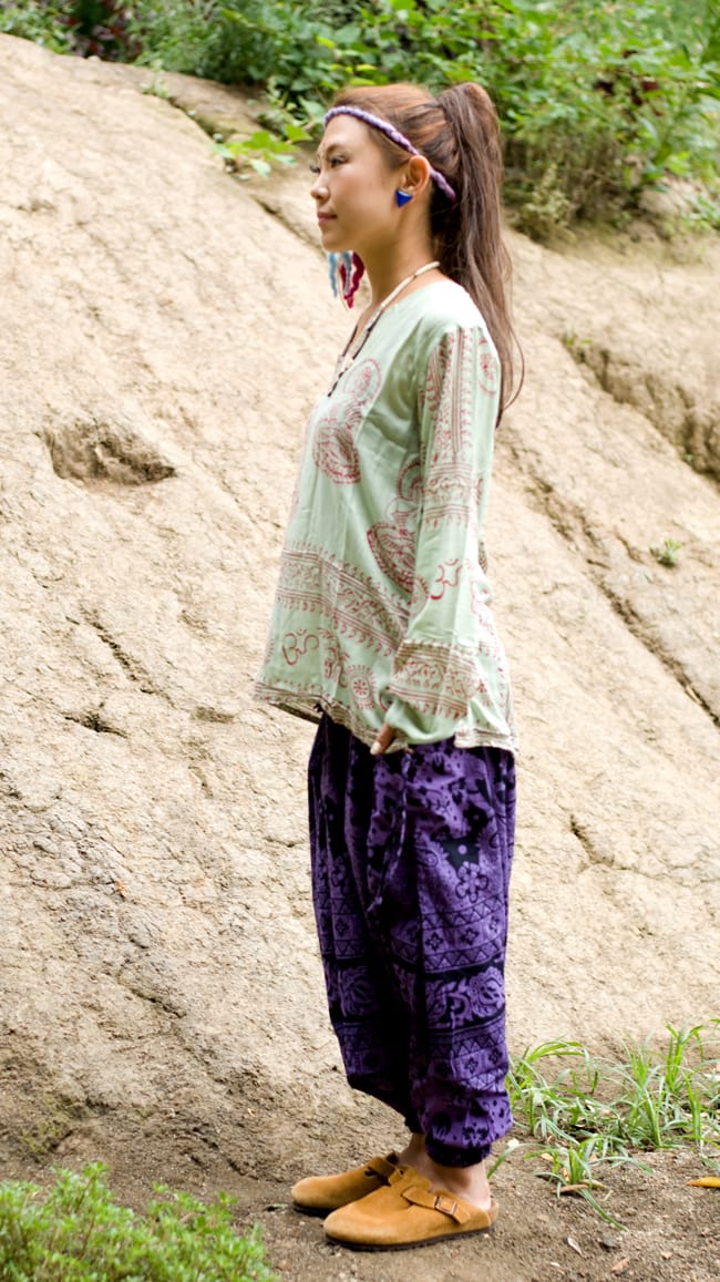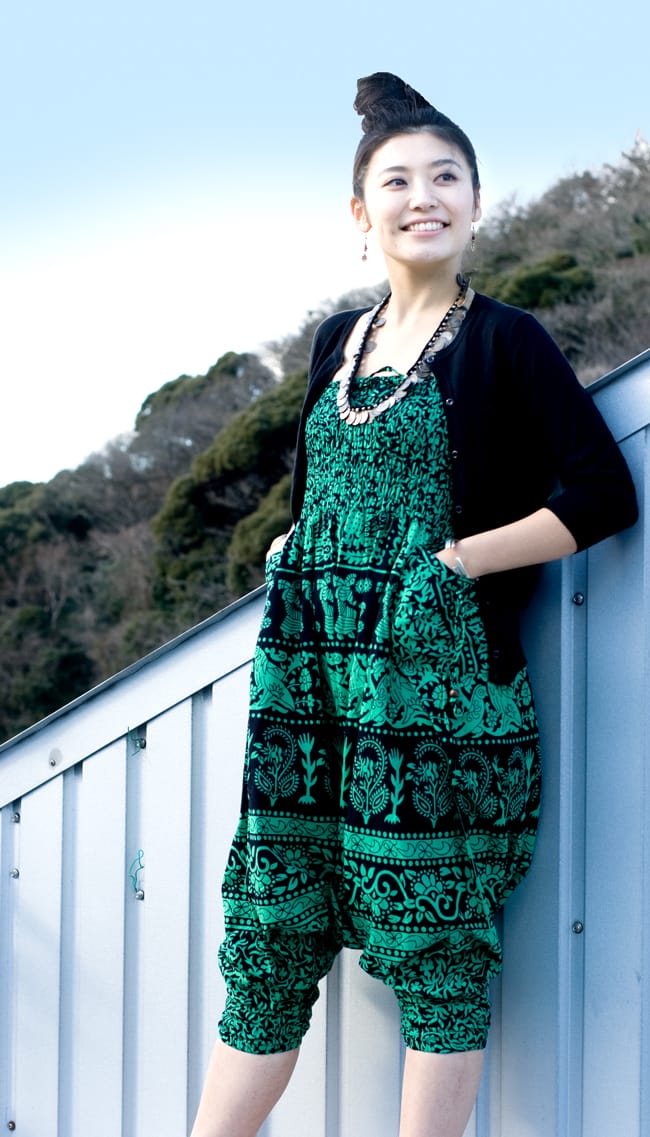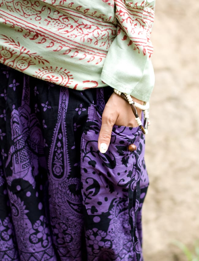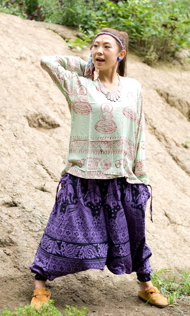 派手好きにはたまらない!ぞうさんとお花柄が散りばめられたモモンガパンツがネパールから届きました。広げるとマントのような面白い形が特徴のパンツです。布に包まれているような不思議な履き心地はとってもラクチン!病みつきになっちゃいます。■コットン素材が気持ちいい!