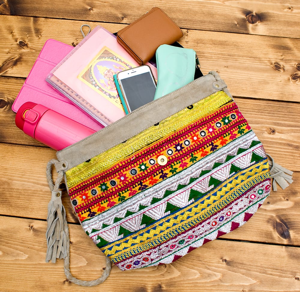 しっかりとしたスウェードのレザー生地に色鮮やかな美しい刺繍が印象的なバッグです。IPADや書籍、水筒等、意外と沢山入ってとても使いやすいサイズです!