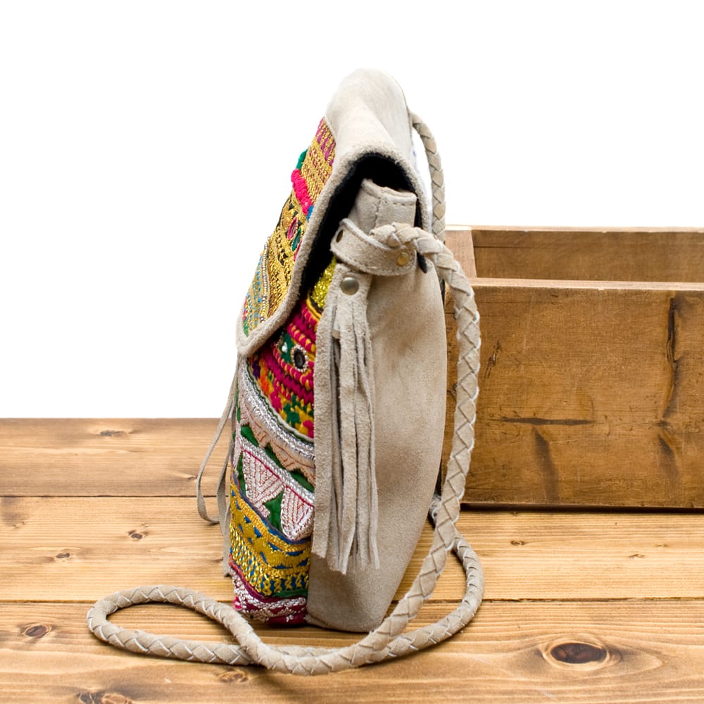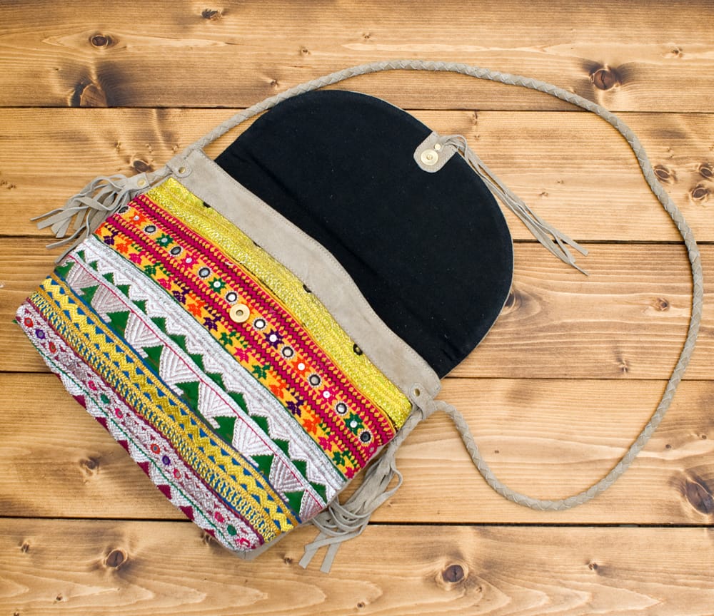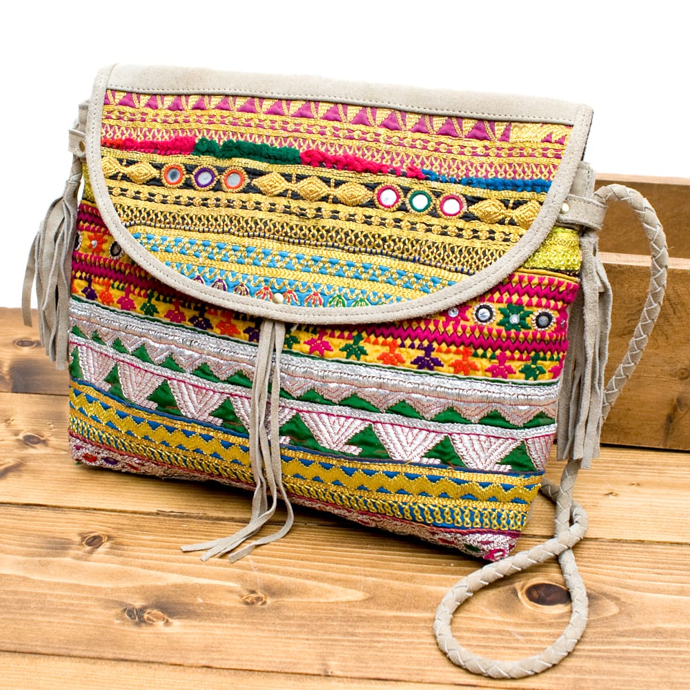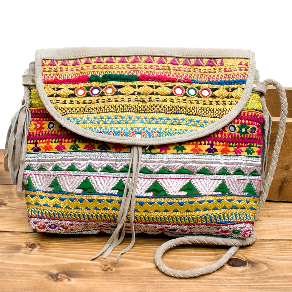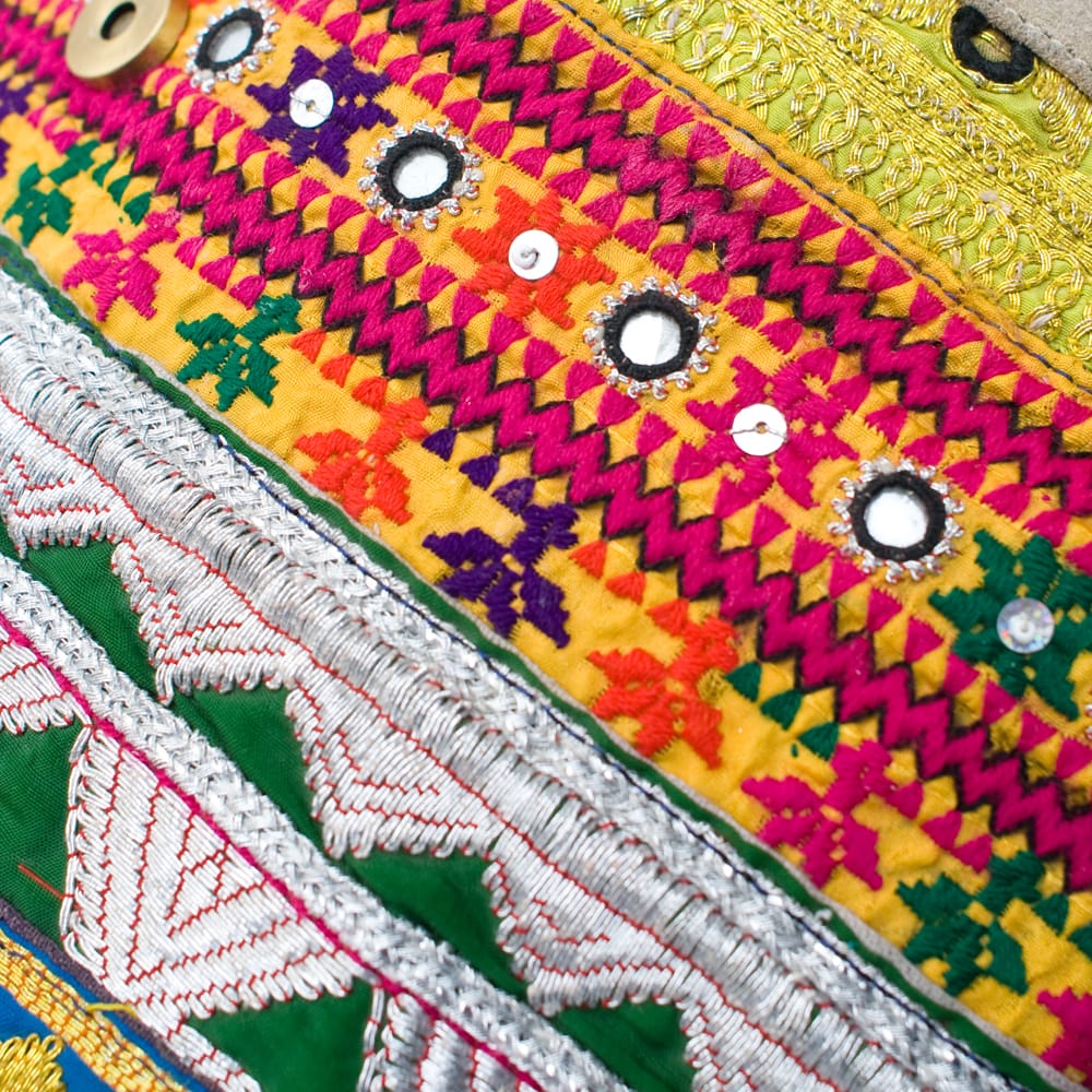アラブ諸国の古布を1枚1枚配置し、パッチワークのようにつなぎ合わせたバッグです。色鮮やかなカラフルな布地に、ビーズやミラーワークがほどこされていたりと、存在感たっぷりのバッグです。古布が1枚1枚職人の手によって合わさり、バッグに生まれ変わる・・・その配色は世界にひとつだけ。
