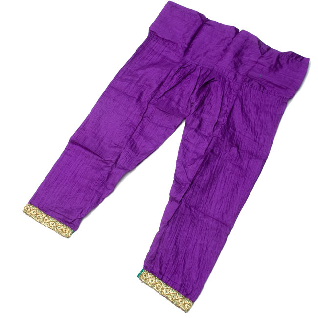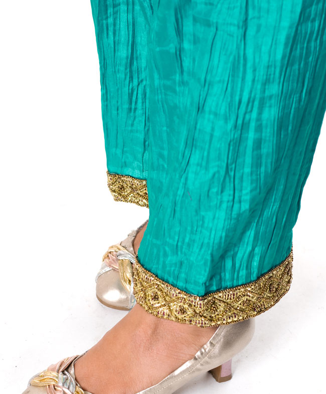パンツのシルエットはいくつか種類があり、次のように分かれています。ゆったりとした「サルワール」、膝辺りから足首までがタイトになっている「チューリーダール、裾がラッパ状に広がった「ベルボトム」。合わせる靴は自由ですが、ある程度ヒールのある靴で合わせてみるとカッコ良いと思います。また、サルワールとチューリーダールはウエストが1m以上あるのが一般的と言われており、付属の紐を通し、きゅっと縛って履きこなして下さい。★こちらのデザインは、腕まわりが小さいデザインとなっております。肩幅のある方などは着脱しにくい可能性もございます。ご注意下さいませ。