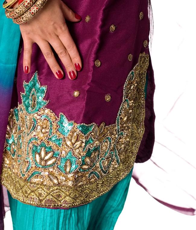 またの名を「サルワール・カミーズ」とも呼ばれる、南アジアの民族衣装です。シャツを意味する「カミーズ」、ズボンを意味する「サルワール」、「ドゥパッタ」と呼ばれるショールの3点セットで着用します。3点セットなので、お色味もコーディネートされていてとても統一感があります。インドでは、サリーに比べると若年層が愛用しているというイメージでしょうか。デザインもパンツなので動きやすくスタイリッシュなデザインとなっています。■スパンコールやビーズ、刺繍で華やか