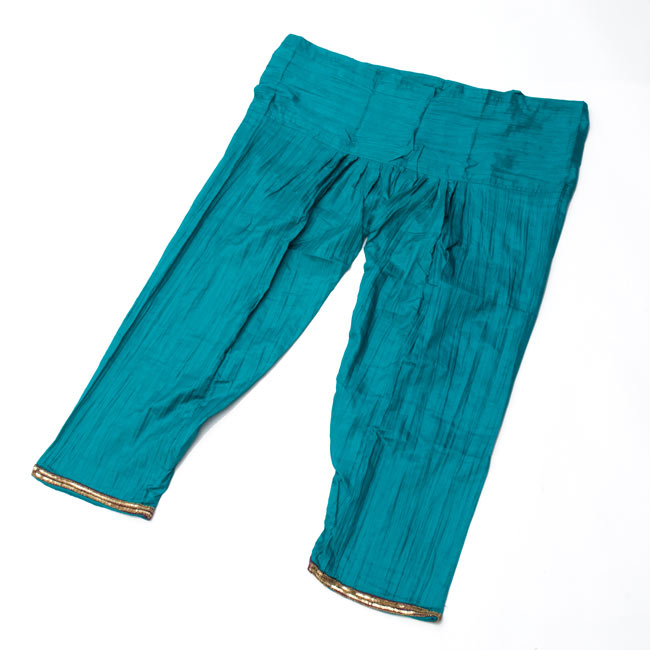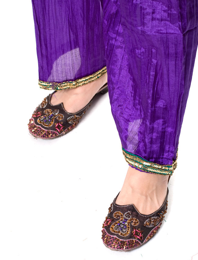 パンツのシルエットはいくつか種類があり、次のように分かれています。ゆったりとした「サルワール」、膝辺りから足首までがタイトになっている「チューリーダール、裾がラッパ状に広がった「ベルボトム」。合わせる靴は自由ですが、ある程度ヒールのある靴で合わせてみるとカッコ良いと思います。また、サルワールとチューリーダールはウエストが1m以上あるのが一般的と言われており、付属の紐を通し、きゅっと縛って履きこなして下さい。
