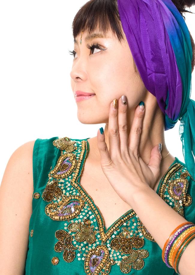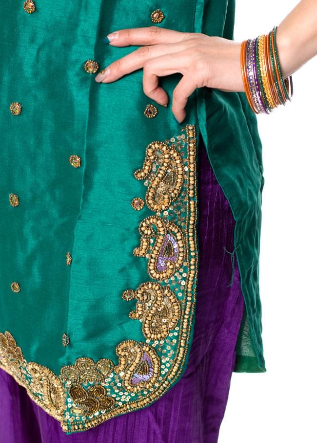 パンジャビ・ドレス3点セット - グリーンの商品写真 9枚目 スパンコールとビーズがゴージャスです。(こちらは同デザインの色違いです。)